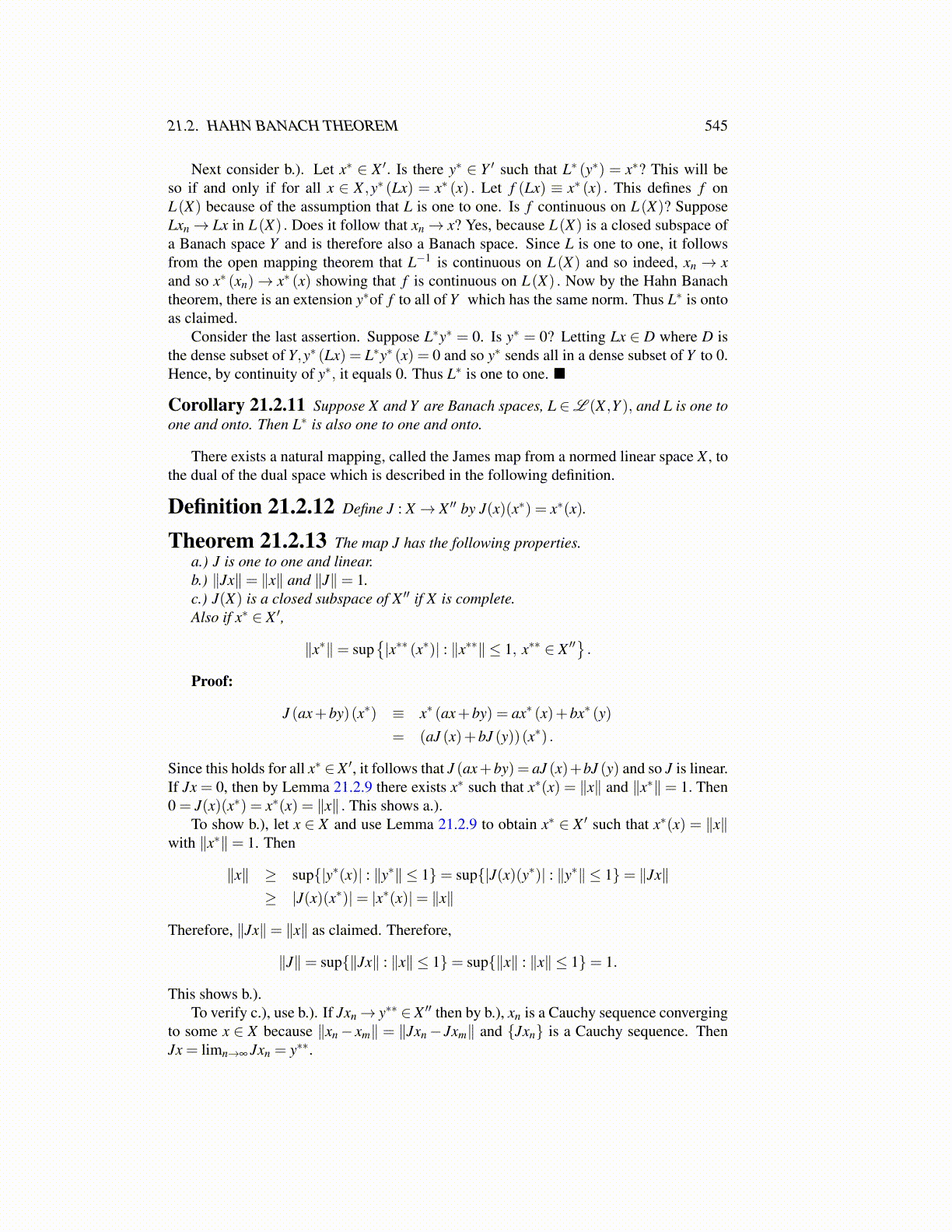 Theorem 21.2.13 The map J has the following properties.a.) J is one to one and linear.b.) ∥Jx∥= ∥x∥ and ∥J∥= 1.c.) J(X) is a closed subspace of X ′′ if X is complete.Also if x∗ ∈ X ′,