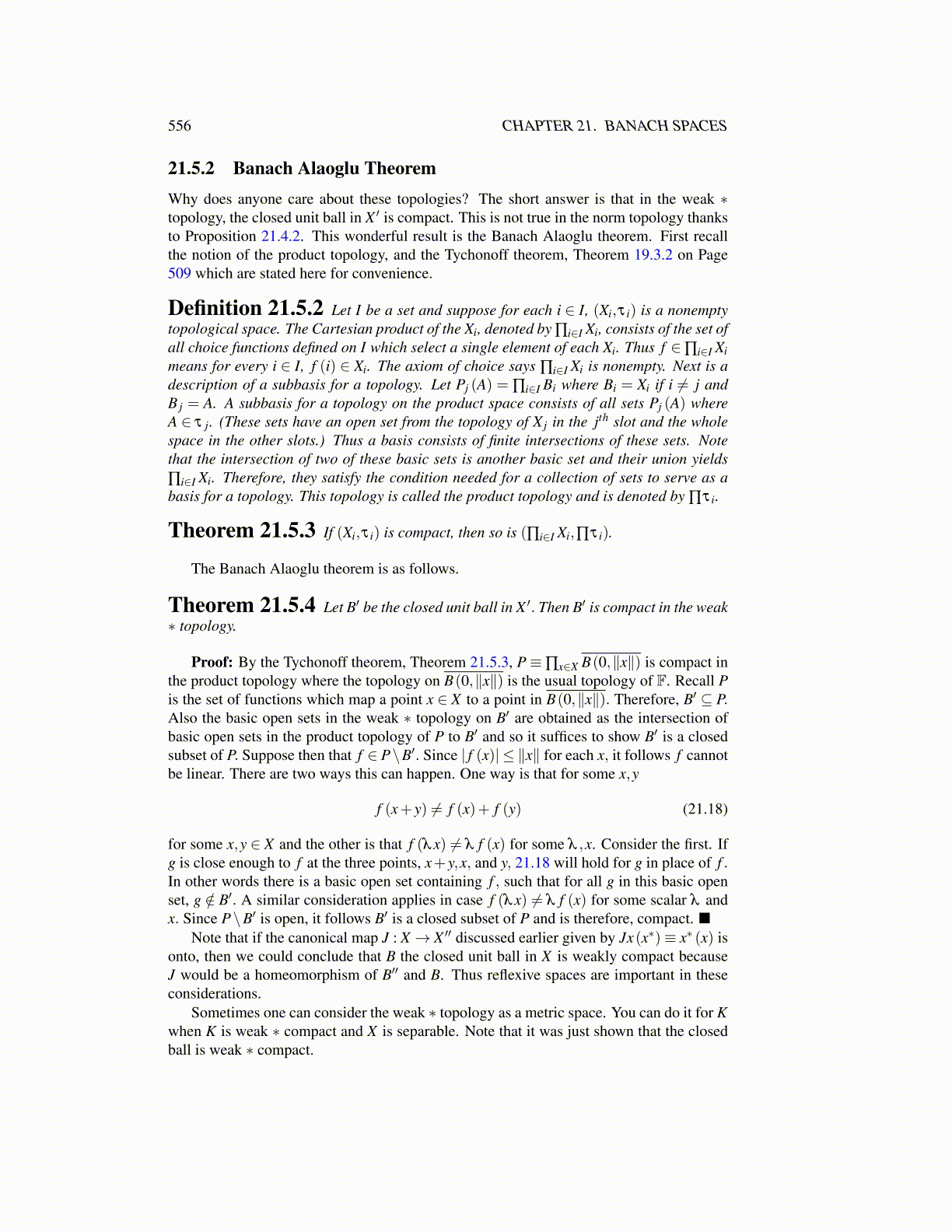 21.5.2 Banach Alaoglu TheoremWhy does anyone care about these topologies? The short answer is that in the weak ∗topology, the closed unit ball in X ′ is compact. This is not true in the norm topology thanksto Proposition 21.4.2. This wonderful result is the Banach Alaoglu theorem. First recallthe notion of the product topology, and the Tychonoff theorem, Theorem 19.3.2 on Page509 which are stated here for convenience.