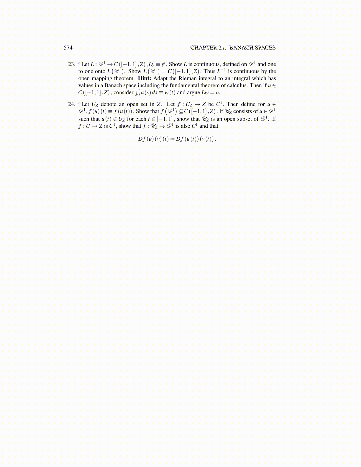 24. ↑Let UZ denote an open set in Z. Let f : UZ → Z be C1. Then define for u ∈D1, f (u)(t)≡ f (u(t)) . Show that f