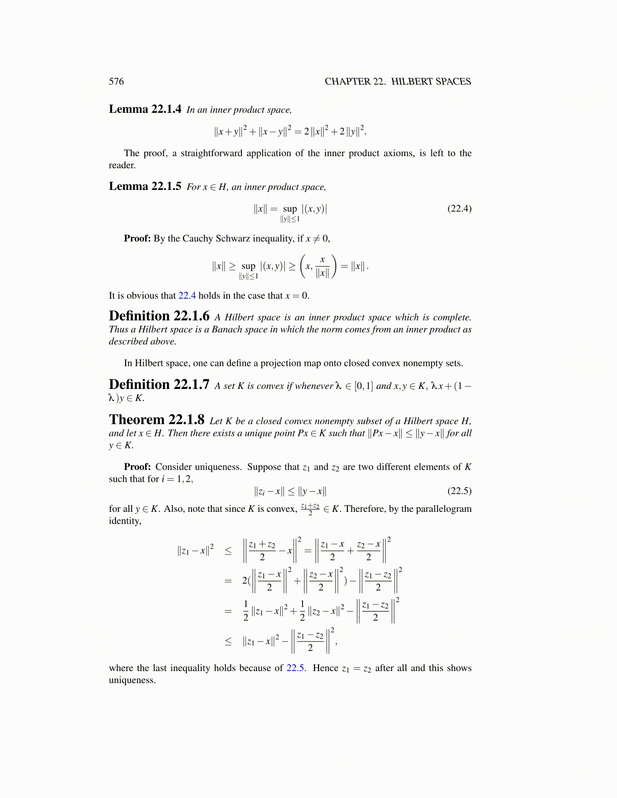 Theorem 22.1.8 Let K be a closed convex nonempty subset of a Hilbert space H,and let x ∈H. Then there exists a unique point Px ∈ K such that ∥Px− x∥ ≤ ∥y− x∥ for ally ∈ K.