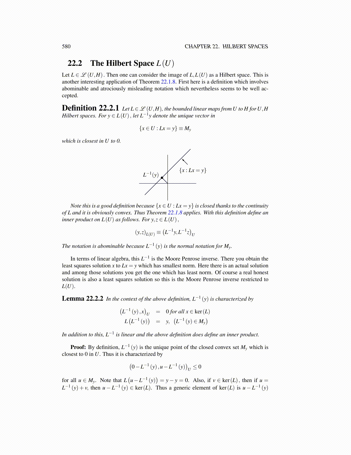 Note this is a good definition because {x ∈U : Lx = y} is closed thanks to the continuityof L and it is obviously convex. Thus Theorem 22.1.8 applies. With this definition define aninner product on L(U) as follows. For y,z ∈ L(U) ,