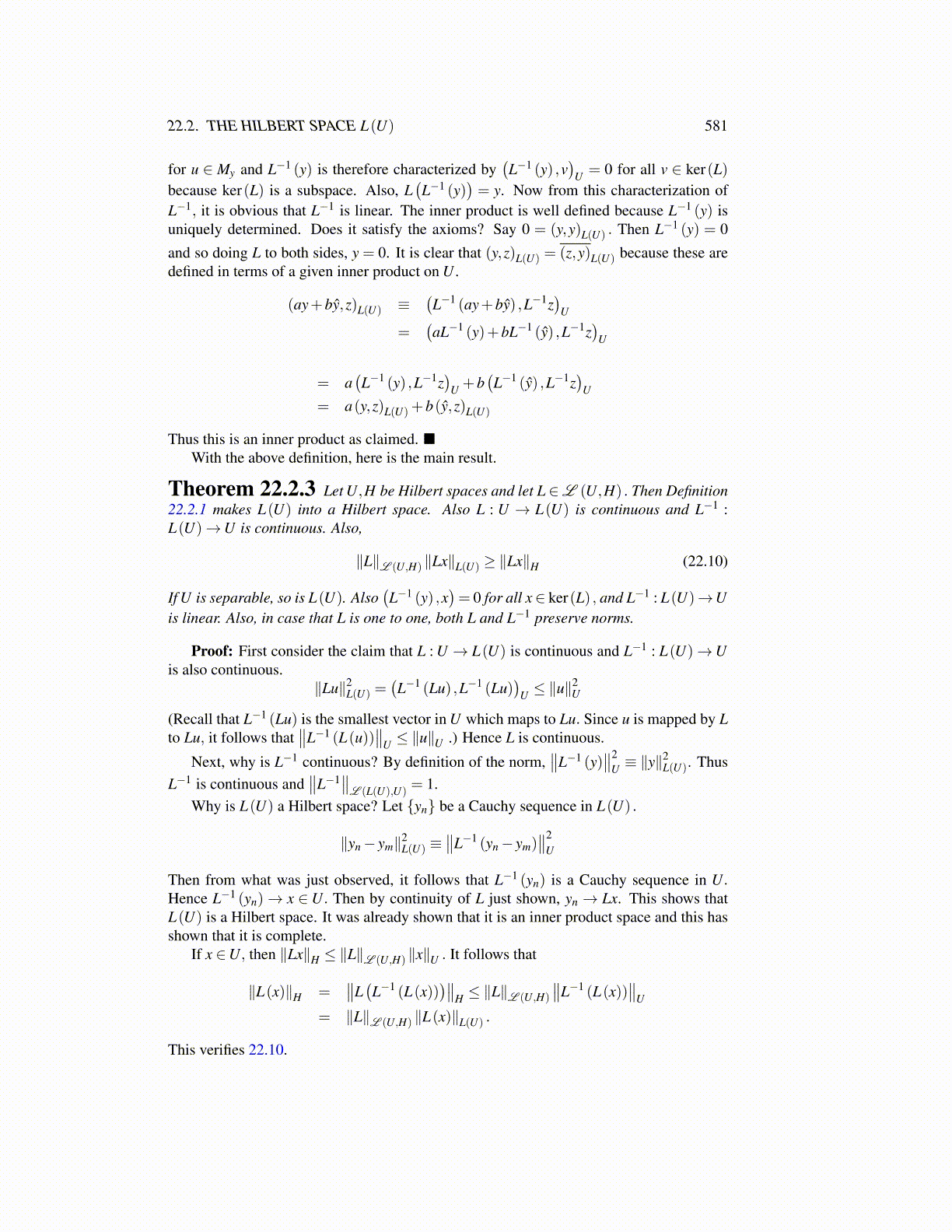 Theorem 22.2.3 Let U,H be Hilbert spaces and let L ∈L (U,H) . Then Definition22.2.1 makes L(U) into a Hilbert space. Also L : U → L(U) is continuous and L−1 :L(U)→U is continuous. Also,