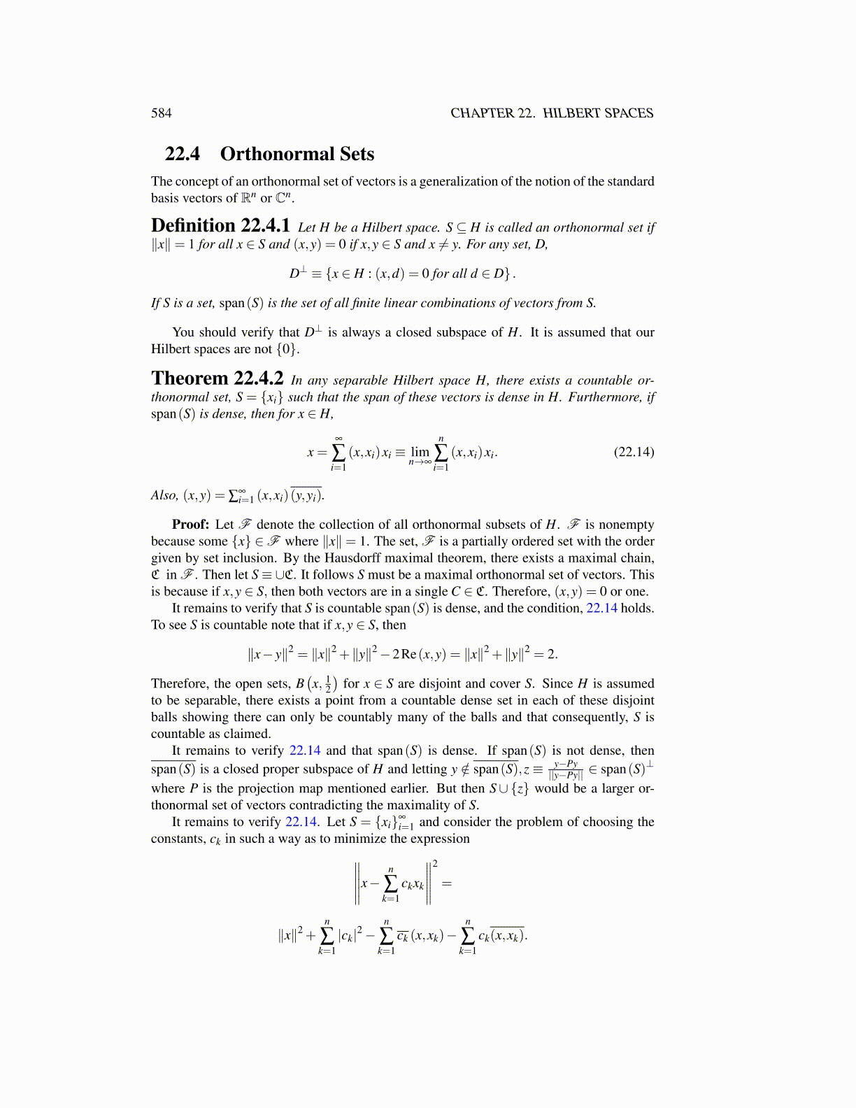 Theorem 22.4.2 In any separable Hilbert space H, there exists a countable or-thonormal set, S = {xi} such that the span of these vectors is dense in H. Furthermore, ifspan(S) is dense, then for x ∈ H,