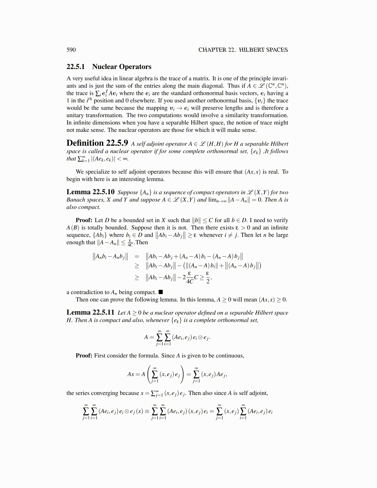 Definition 22.5.9 A self adjoint operator A ∈L (H,H) for H a separable Hilbertspace is called a nuclear operator if for some complete orthonormal set, {ek} ,It followsthat ∑