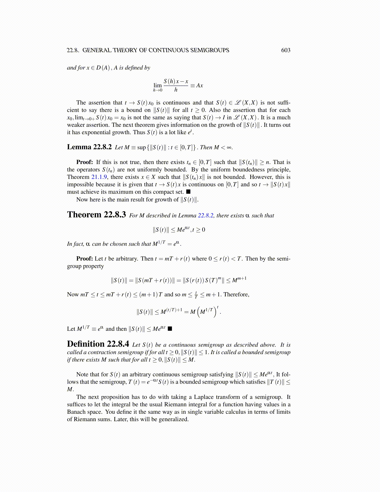 Definition 22.8.4 Let S (t) be a continuous semigroup as described above. It iscalled a contraction semigroup if for all t ≥ 0,∥S (t)∥≤ 1. It is called a bounded semigroupif there exists M such that for all t ≥ 0,∥S (t)∥ ≤M.