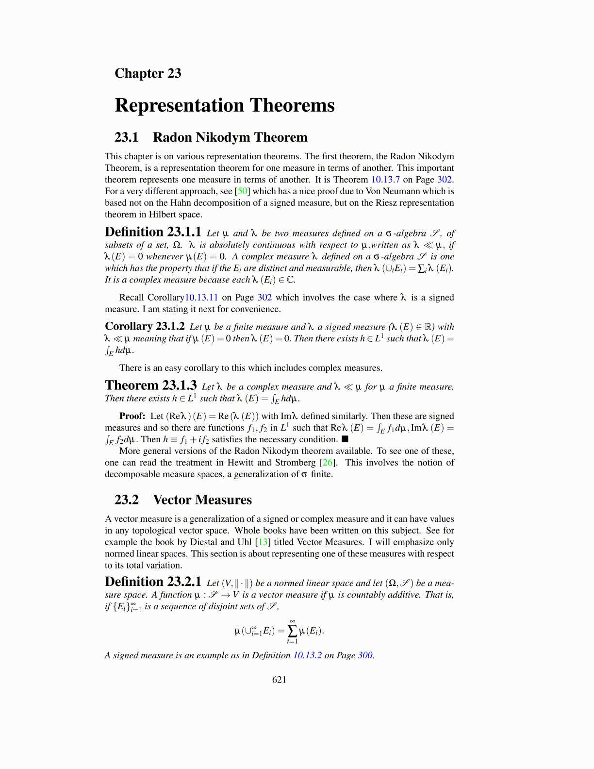Corollary 23.1.2 Let µ be a finite measure and λ a signed measure (λ (E) ∈ R) withλ ≪ µ meaning that if µ (E) = 0 then λ (E) = 0. Then there exists h∈ L1 such that λ (E) =∫