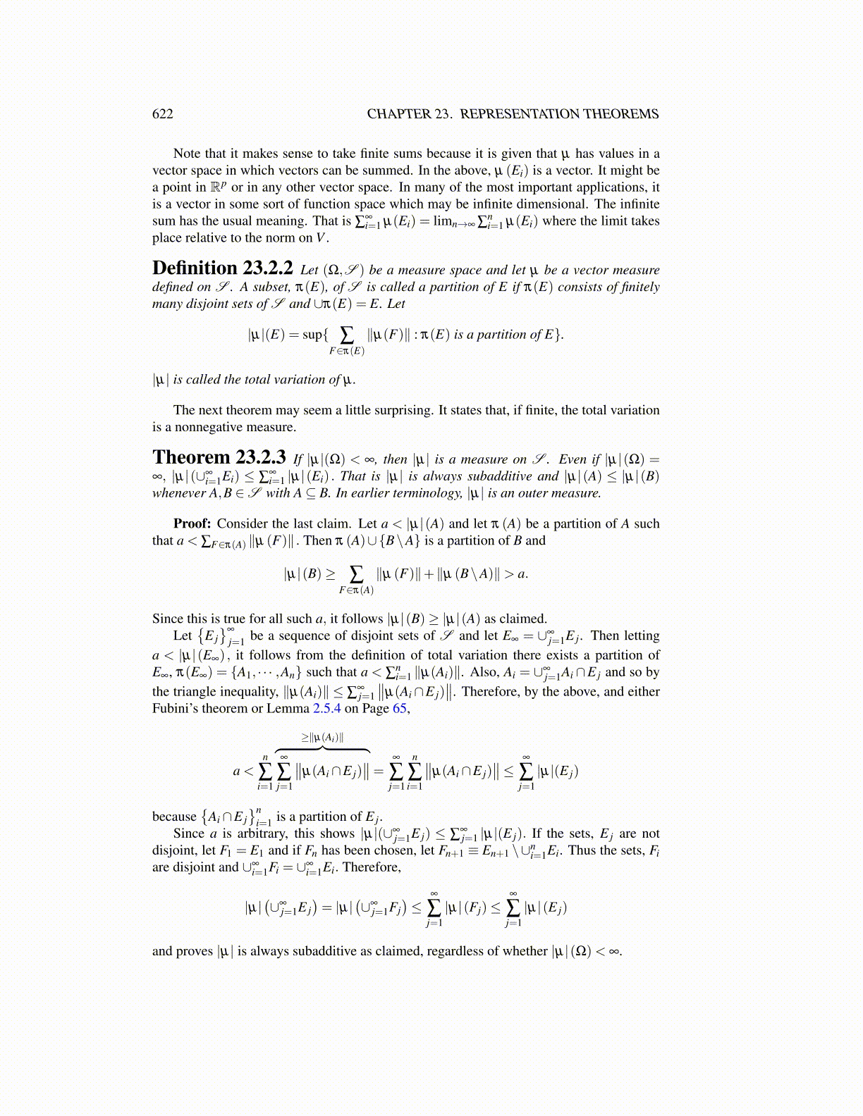 Theorem 23.2.3 If |µ|(Ω) < ∞, then |µ| is a measure on S . Even if |µ|(Ω) =∞, |µ|(∪∞