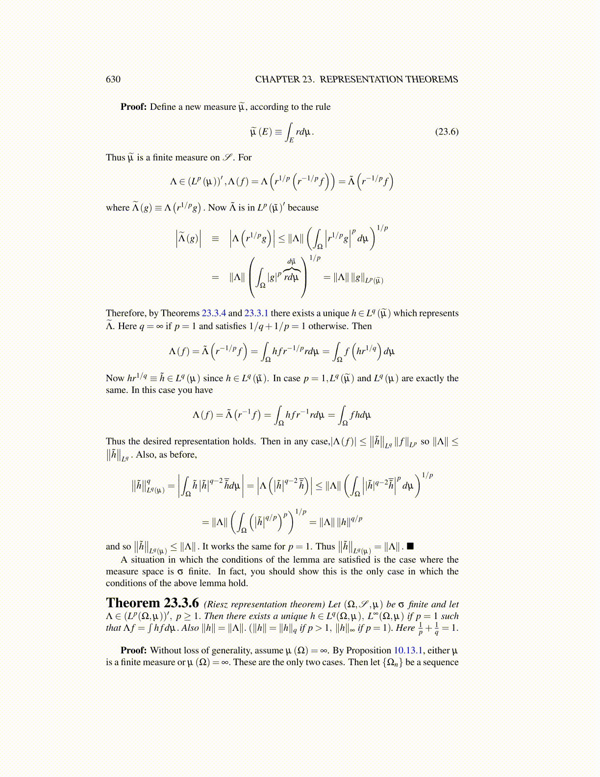 Theorem 23.3.6 (Riesz representation theorem) Let (Ω,S ,µ) be σ finite and letΛ ∈ (Lp(Ω,µ))′, p ≥ 1. Then there exists a unique h ∈ Lq(Ω,µ), L∞(Ω,µ) if p = 1 suchthat Λ f =
