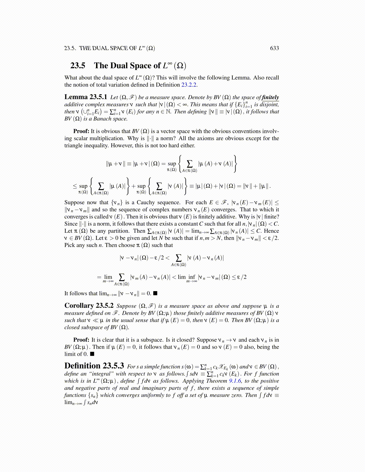 Lemma 23.5.1 Let (Ω,F ) be a measure space. Denote by BV (Ω) the space of finitelyadditive complex measures ν such that |ν |(Ω)< ∞. This means that if {Ei}n