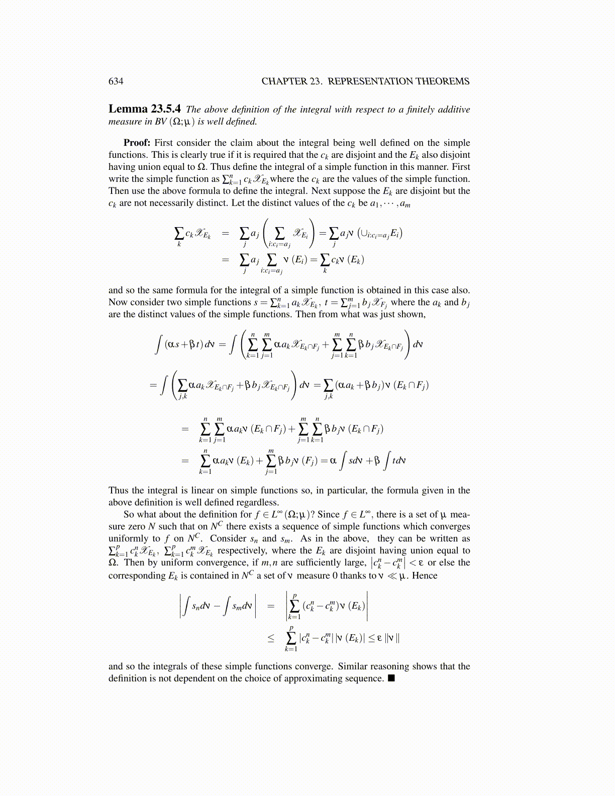 Lemma 23.5.4 The above definition of the integral with respect to a finitely additivemeasure in BV (Ω; µ) is well defined.