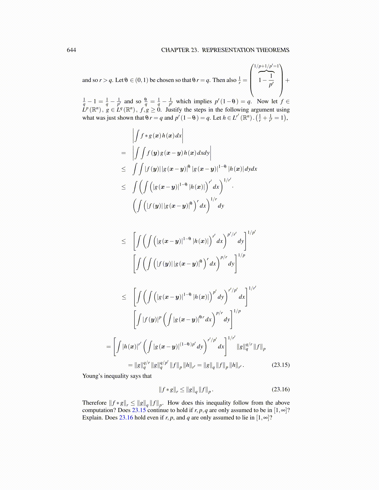 Therefore ∥ f ∗g∥r ≤ ∥g∥q ∥ f∥p. How does this inequality follow from the abovecomputation? Does 23.15 continue to hold if r, p,q are only assumed to be in [1,∞]?Explain. Does 23.16 hold even if r, p, and q are only assumed to lie in [1,∞]?