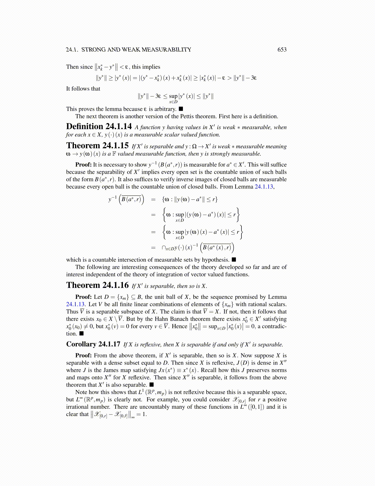 Proof: It is necessary to show y−1 (B(a∗,r)) is measurable for a∗ ∈ X ′. This will sufficebecause the separability of X ′ implies every open set is the countable union of such ballsof the form B(a∗,r). It also suffices to verify inverse images of closed balls are measurablebecause every open ball is the countable union of closed balls. From Lemma 24.1.13,