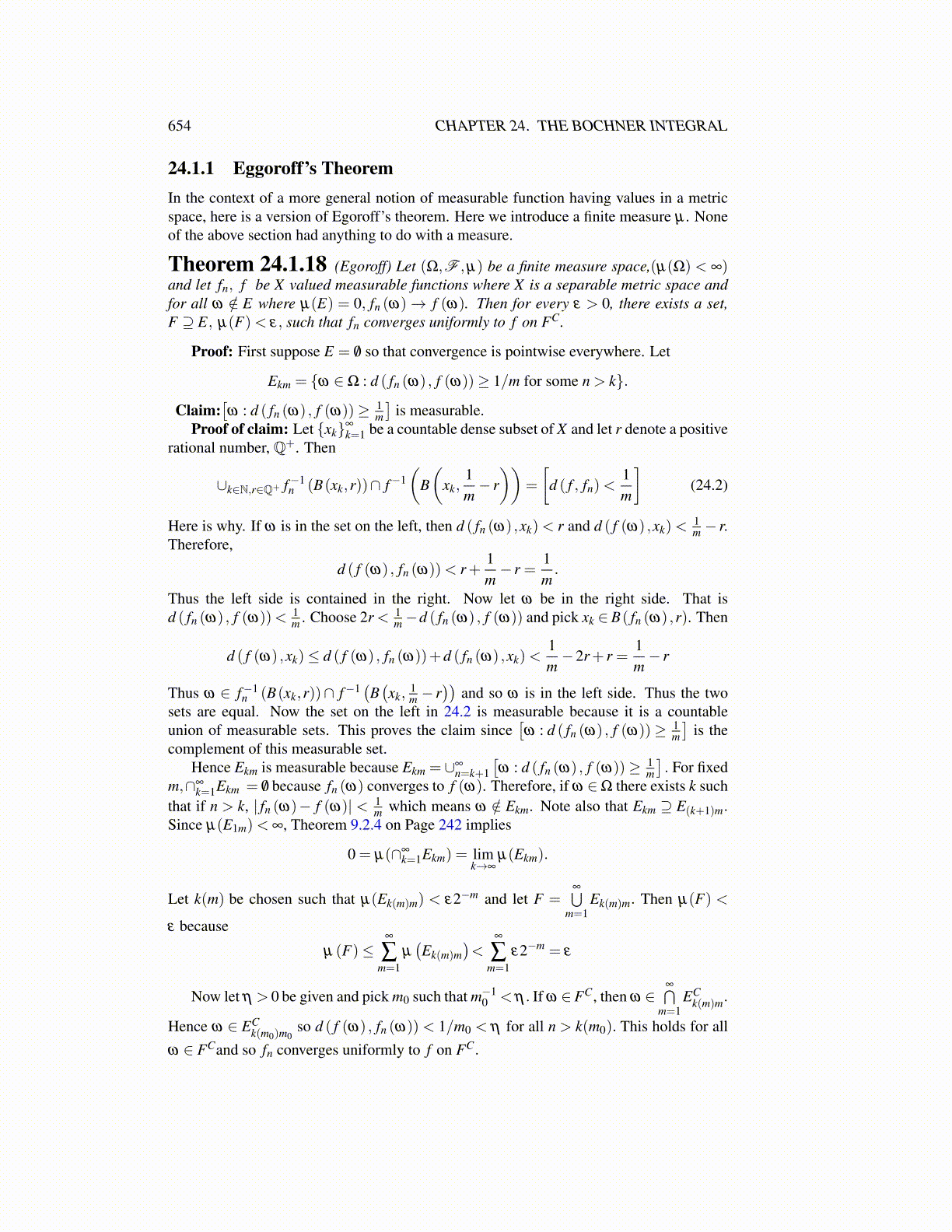 24.1.1 Eggoroff’s TheoremIn the context of a more general notion of measurable function having values in a metricspace, here is a version of Egoroff’s theorem. Here we introduce a finite measure µ . Noneof the above section had anything to do with a measure.
