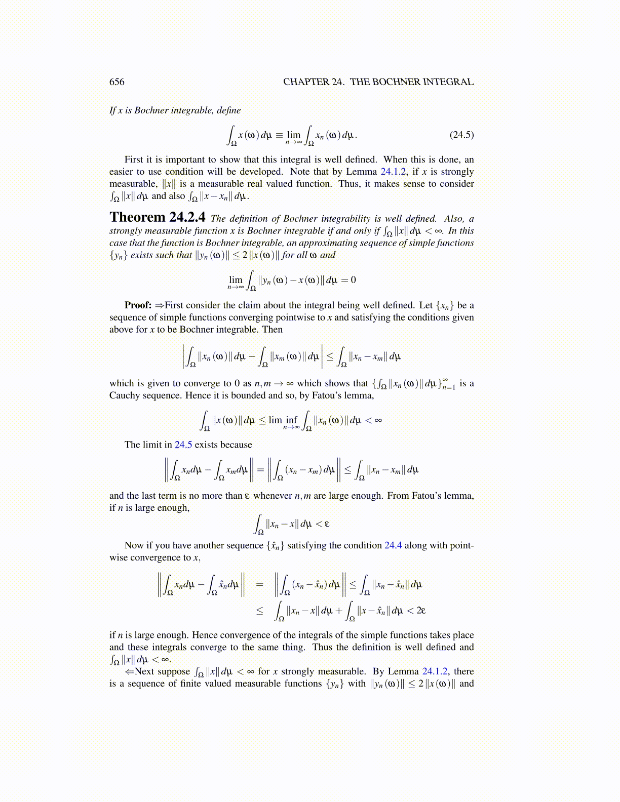 Theorem 24.2.4 The definition of Bochner integrability is well defined. Also, astrongly measurable function x is Bochner integrable if and only if
