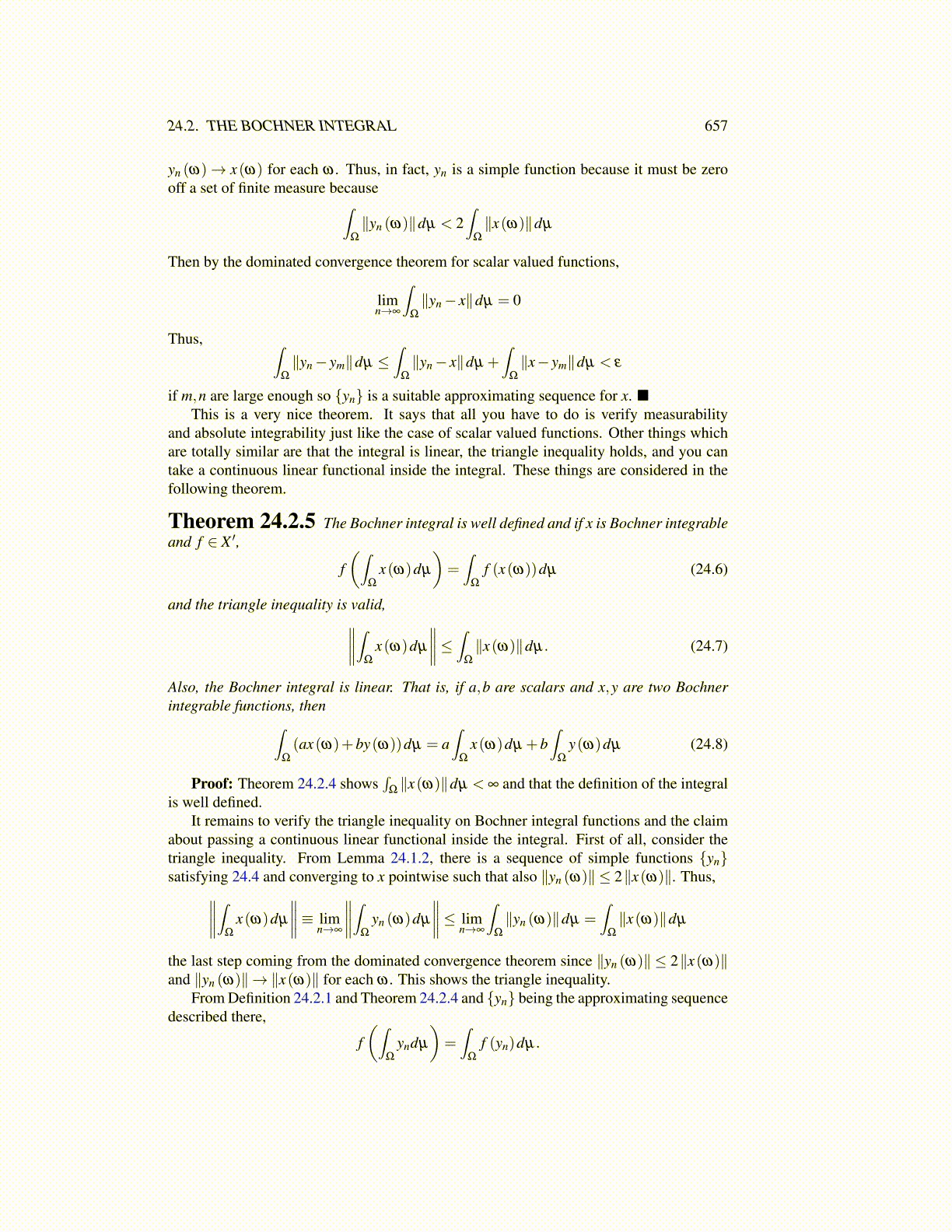 about passing a continuous linear functional inside the integral. First of all, consider thetriangle inequality. From Lemma 24.1.2, there is a sequence of simple functions {yn}satisfying 24.4 and converging to x pointwise such that also ∥yn (ω)∥ ≤ 2∥x(ω)∥. Thus,∥∥∥∥∫