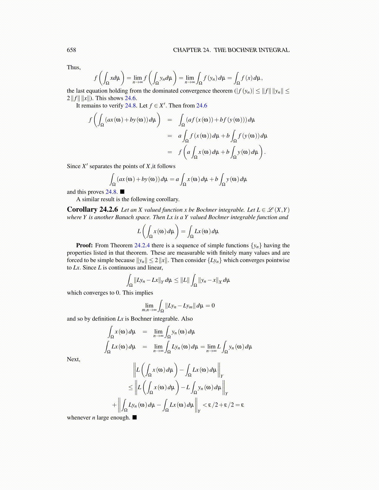 the last equation holding from the dominated convergence theorem (| f (yn)| ≤ ∥ f∥∥yn∥ ≤2∥ f∥∥x∥). This shows 24.6.