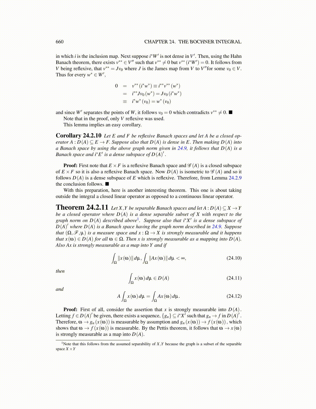 Theorem 24.2.11 Let X ,Y be separable Banach spaces and let A : D(A)⊆ X→Ybe a closed operator where D(A) is a dense separable subset of X with respect to thegraph norm on D(A) described above1. Suppose also that i∗X ′ is a dense subspace ofD(A)′ where D(A) is a Banach space having the graph norm described in 24.9. Supposethat (Ω,F ,µ) is a measure space and x : Ω→ X is strongly measurable and it happensthat x(ω) ∈ D(A) for all ω ∈ Ω. Then x is strongly measurable as a mapping into D(A).Also Ax is strongly measurable as a map into Y and if∫