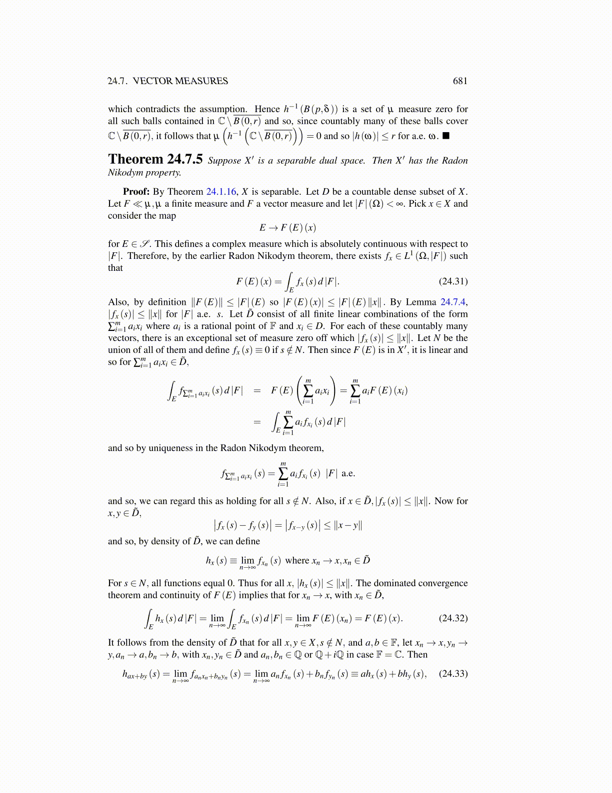 Proof: By Theorem 24.1.16, X is separable. Let D be a countable dense subset of X .Let F≪ µ,µ a finite measure and F a vector measure and let |F |(Ω)< ∞. Pick x ∈ X andconsider the map