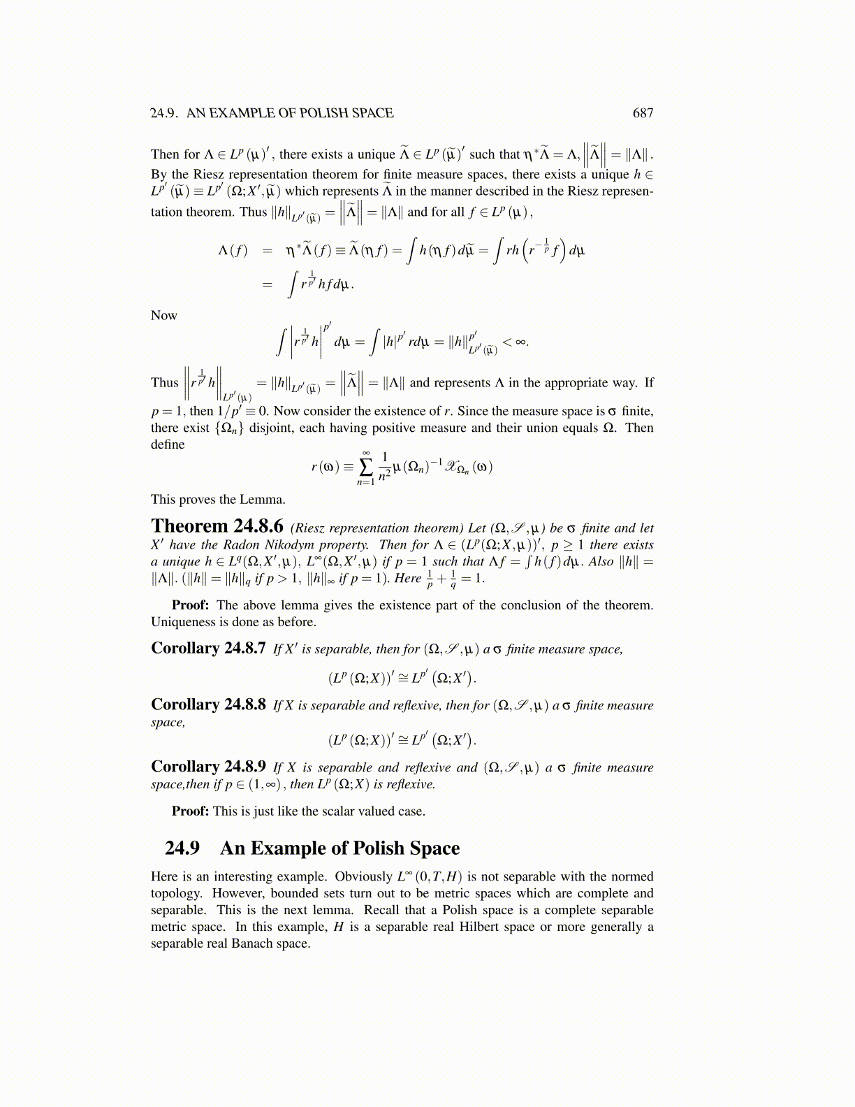 Theorem 24.8.6 (Riesz representation theorem) Let (Ω,S ,µ) be σ finite and letX ′ have the Radon Nikodym property. Then for Λ ∈ (Lp(Ω;X ,µ))′, p ≥ 1 there existsa unique h ∈ Lq(Ω,X ′,µ), L∞(Ω,X ′,µ) if p = 1 such that Λ f =