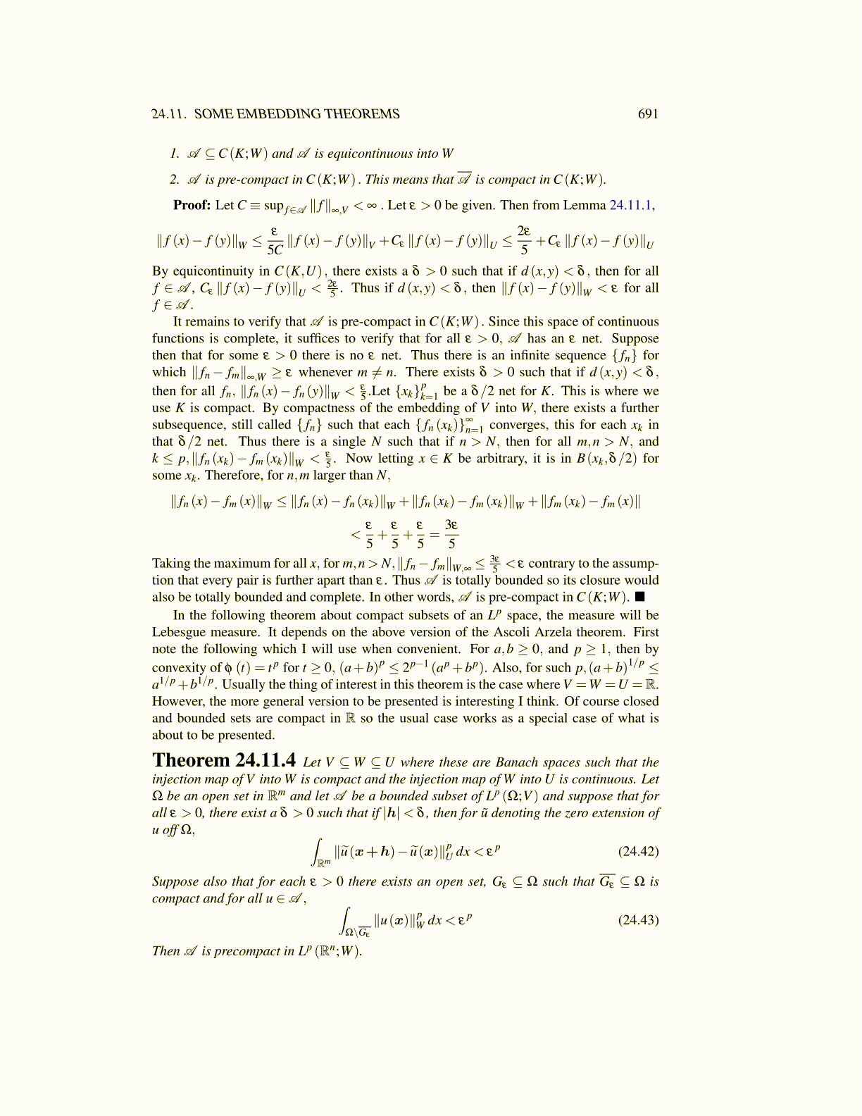 Theorem 24.11.4 Let V ⊆W ⊆ U where these are Banach spaces such that theinjection map of V into W is compact and the injection map of W into U is continuous. LetΩ be an open set in Rm and let A be a bounded subset of Lp (Ω;V ) and suppose that forall ε > 0, there exist a δ > 0 such that if |h|< δ , then for ũ denoting the zero extension ofu off Ω, ∫
