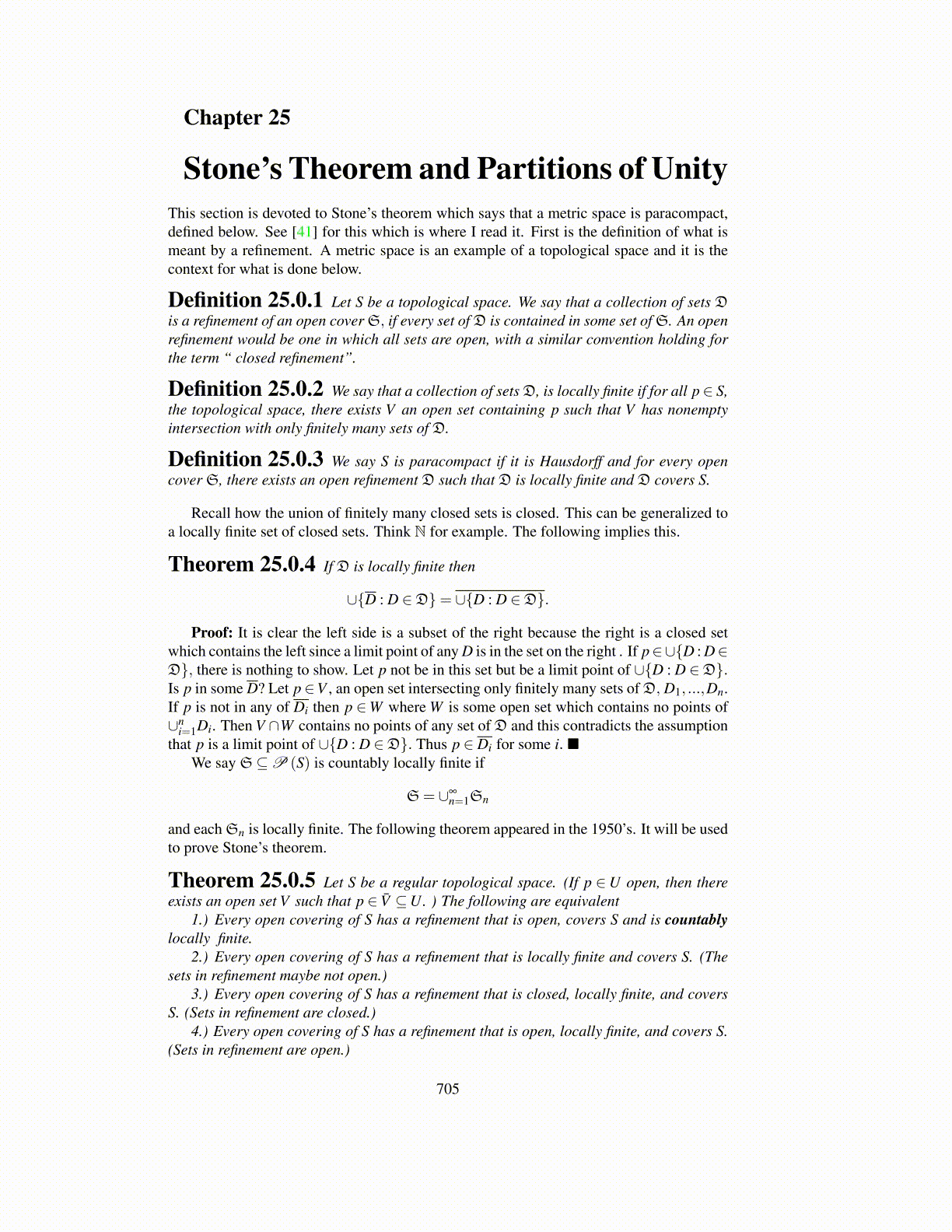 Stone’s Theorem and Partitions of UnityThis section is devoted to Stone’s theorem which says that a metric space is paracompact,defined below. See [41] for this which is where I read it. First is the definition of what ismeant by a refinement. A metric space is an example of a topological space and it is thecontext for what is done below.