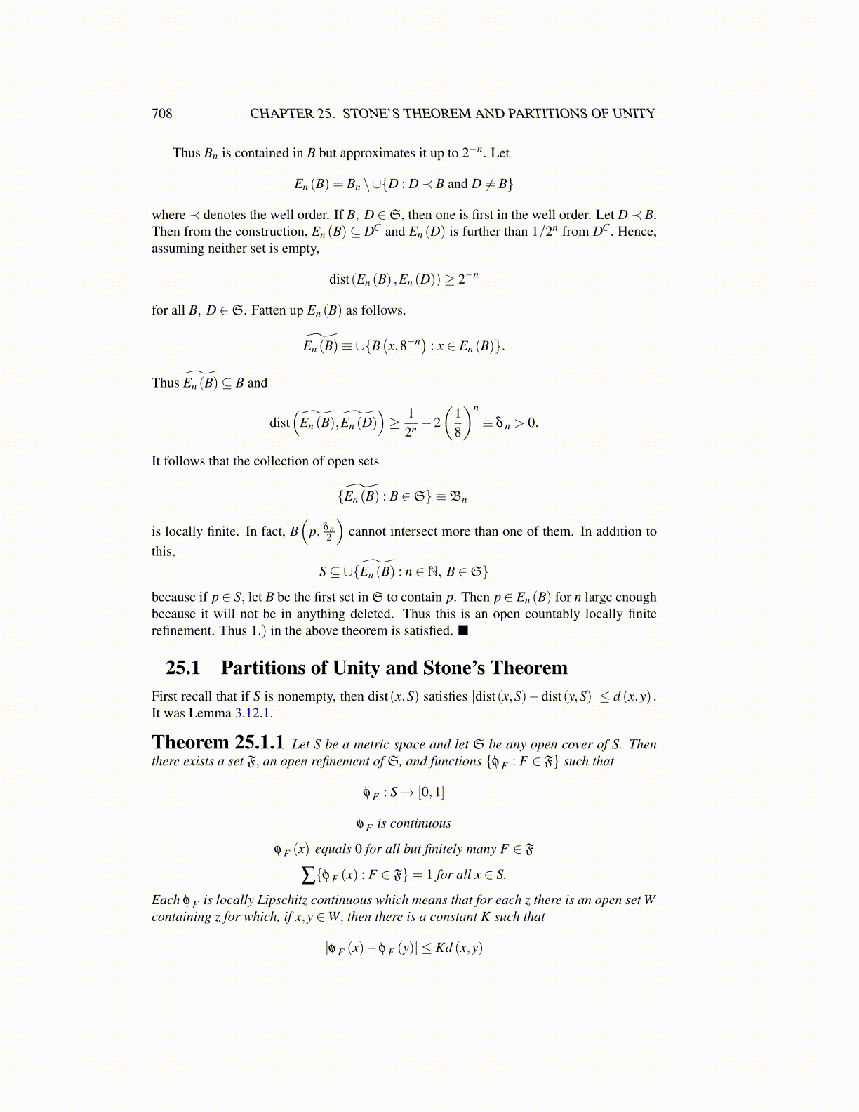 25.1 Partitions of Unity and Stone’s TheoremFirst recall that if S is nonempty, then dist(x,S) satisfies |dist(x,S)−dist(y,S)| ≤ d (x,y) .It was Lemma 3.12.1.