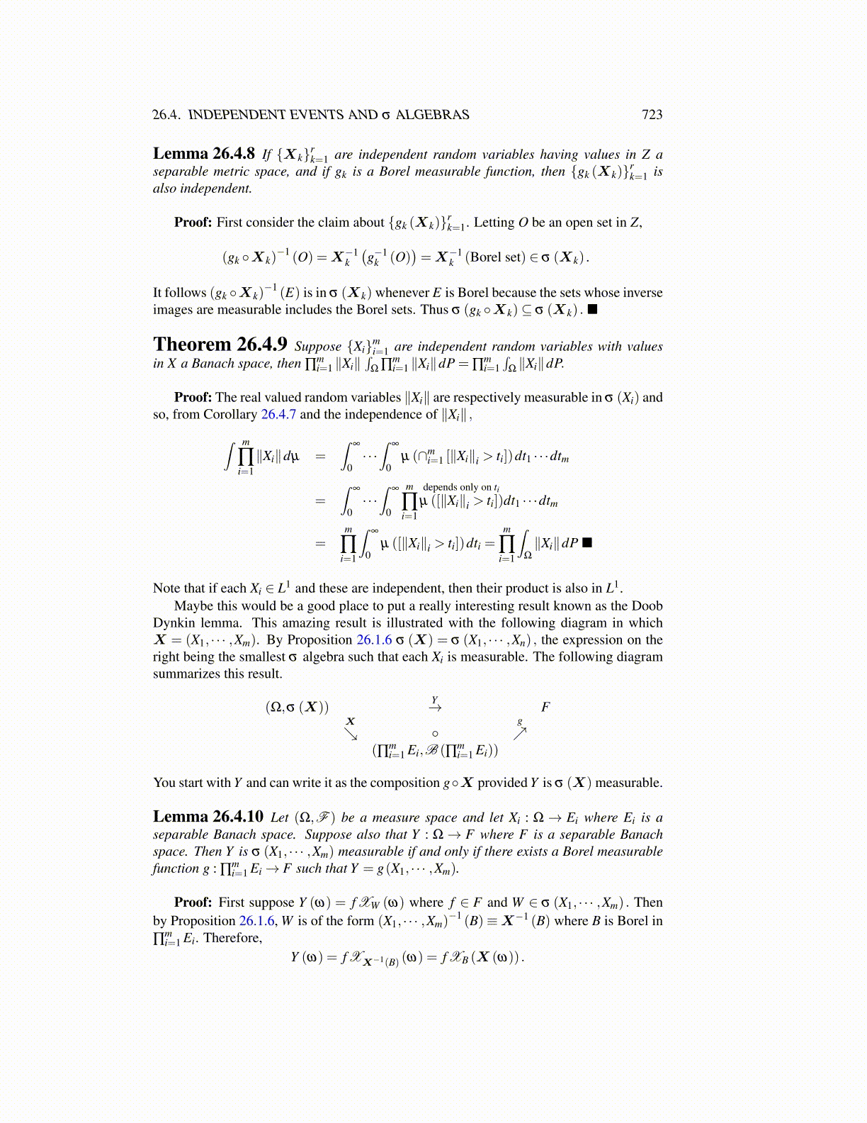 Lemma 26.4.10 Let (Ω,F ) be a measure space and let Xi : Ω→ Ei where Ei is aseparable Banach space. Suppose also that Y : Ω→ F where F is a separable Banachspace. Then Y is σ (X1, · · · ,Xm) measurable if and only if there exists a Borel measurablefunction g : ∏