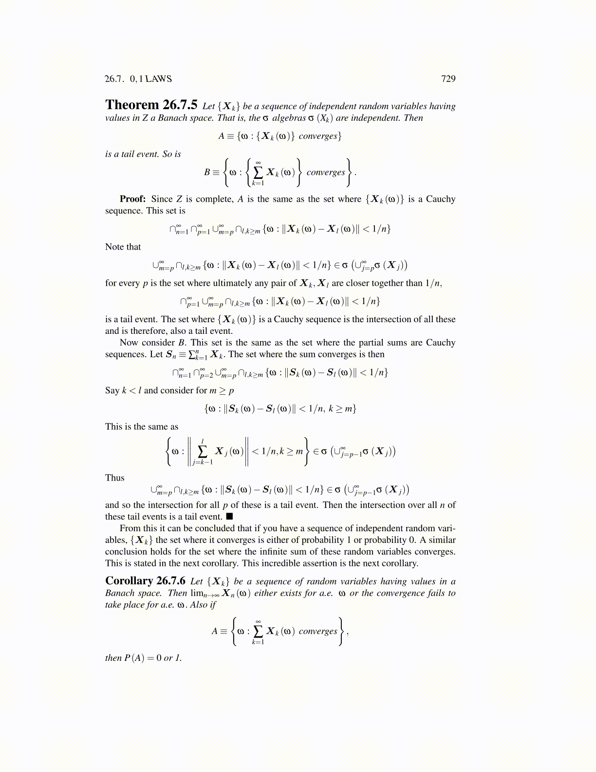 Corollary 26.7.6 Let {Xk} be a sequence of random variables having values in aBanach space. Then limn→∞Xn (ω) either exists for a.e. ω or the convergence fails totake place for a.e. ω. Also if