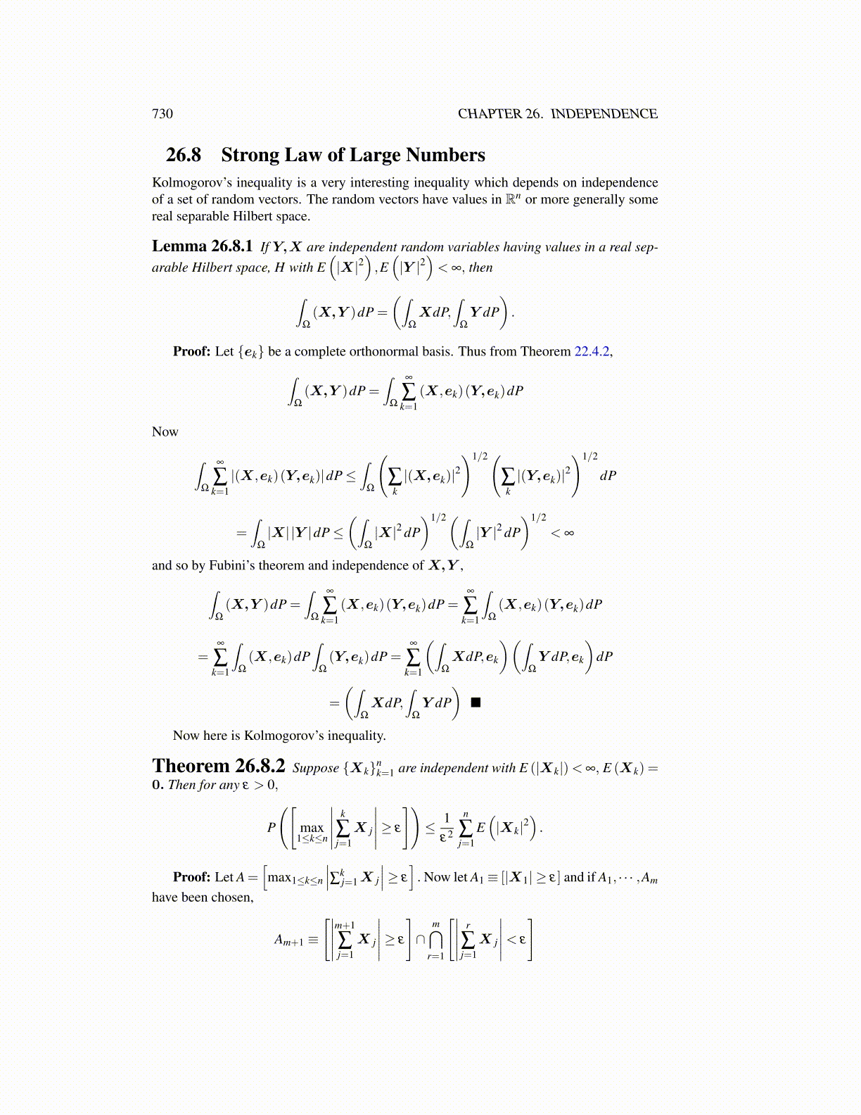 26.8 Strong Law of Large NumbersKolmogorov’s inequality is a very interesting inequality which depends on independenceof a set of random vectors. The random vectors have values in Rn or more generally somereal separable Hilbert space.