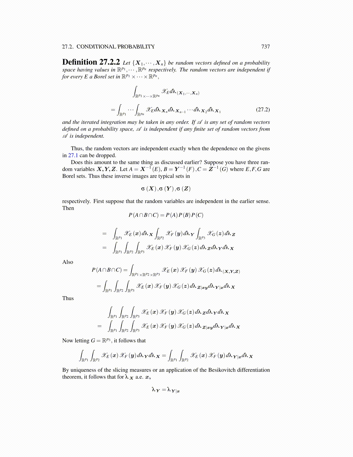 Definition 27.2.2 Let {X1, · · · ,Xn} be random vectors defined on a probabilityspace having values in Rp1 , · · · ,Rpn respectively. The random vectors are independent iffor every E a Borel set in Rp1 ×·· ·×Rpn ,∫