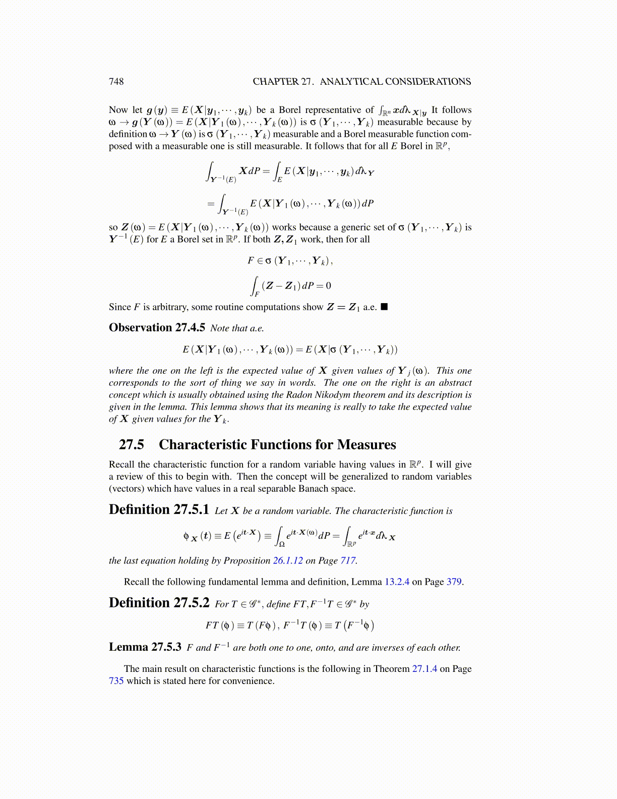 27.5 Characteristic Functions for MeasuresRecall the characteristic function for a random variable having values in Rp. I will givea review of this to begin with. Then the concept will be generalized to random variables(vectors) which have values in a real separable Banach space.