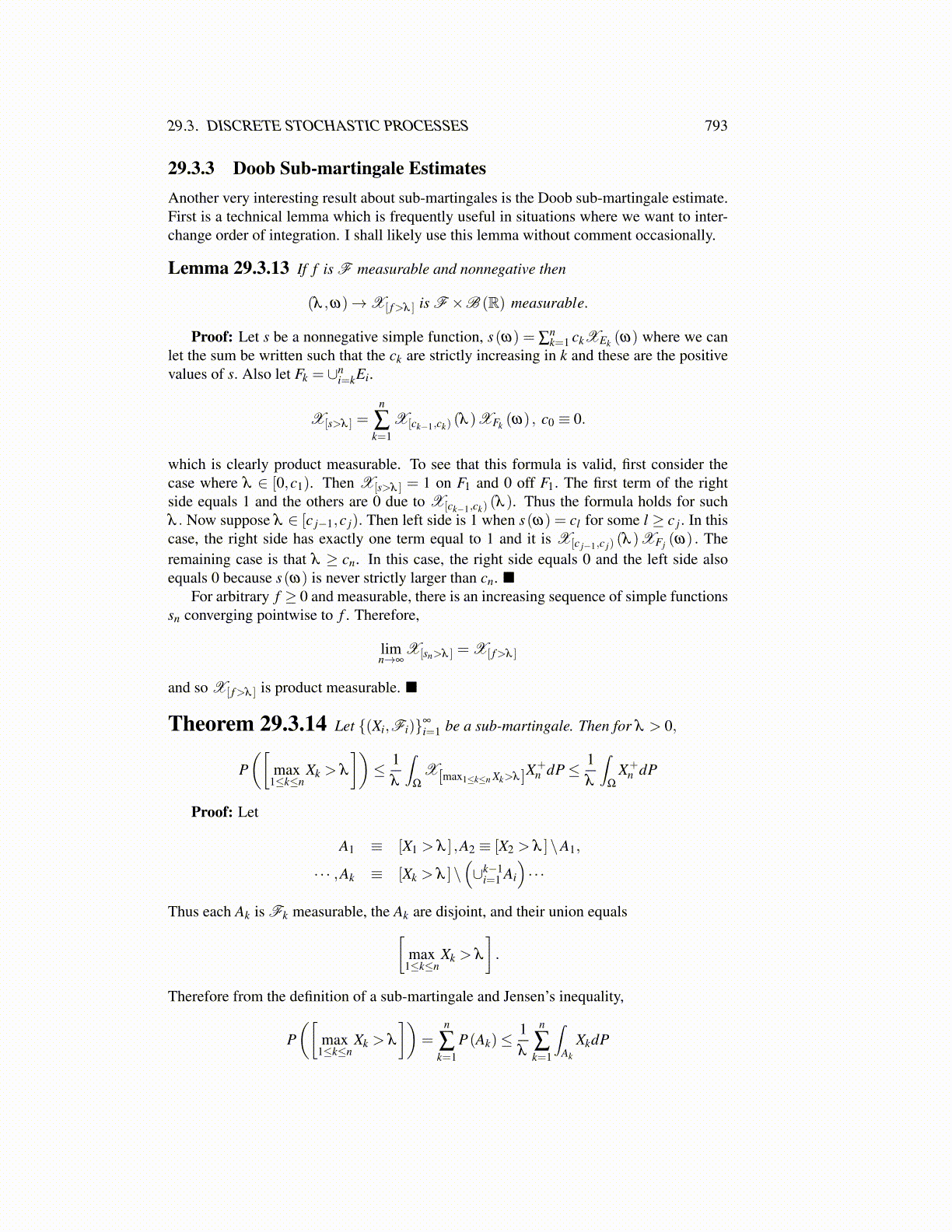 29.3.3 Doob Sub-martingale EstimatesAnother very interesting result about sub-martingales is the Doob sub-martingale estimate.First is a technical lemma which is frequently useful in situations where we want to inter-change order of integration. I shall likely use this lemma without comment occasionally.