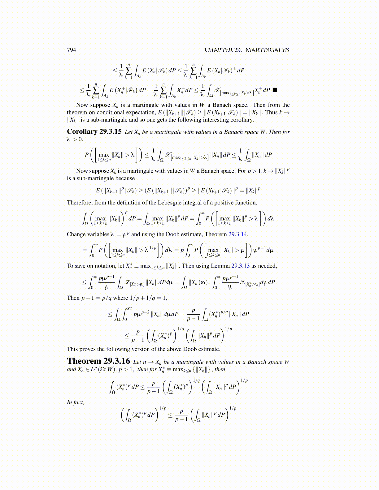 Theorem 29.3.16 Let n→ Xn be a martingale with values in a Banach space Wand Xn ∈ Lp (Ω;W ) , p > 1, then for X∗n ≡maxk≤n {∥Xk∥} , then∫