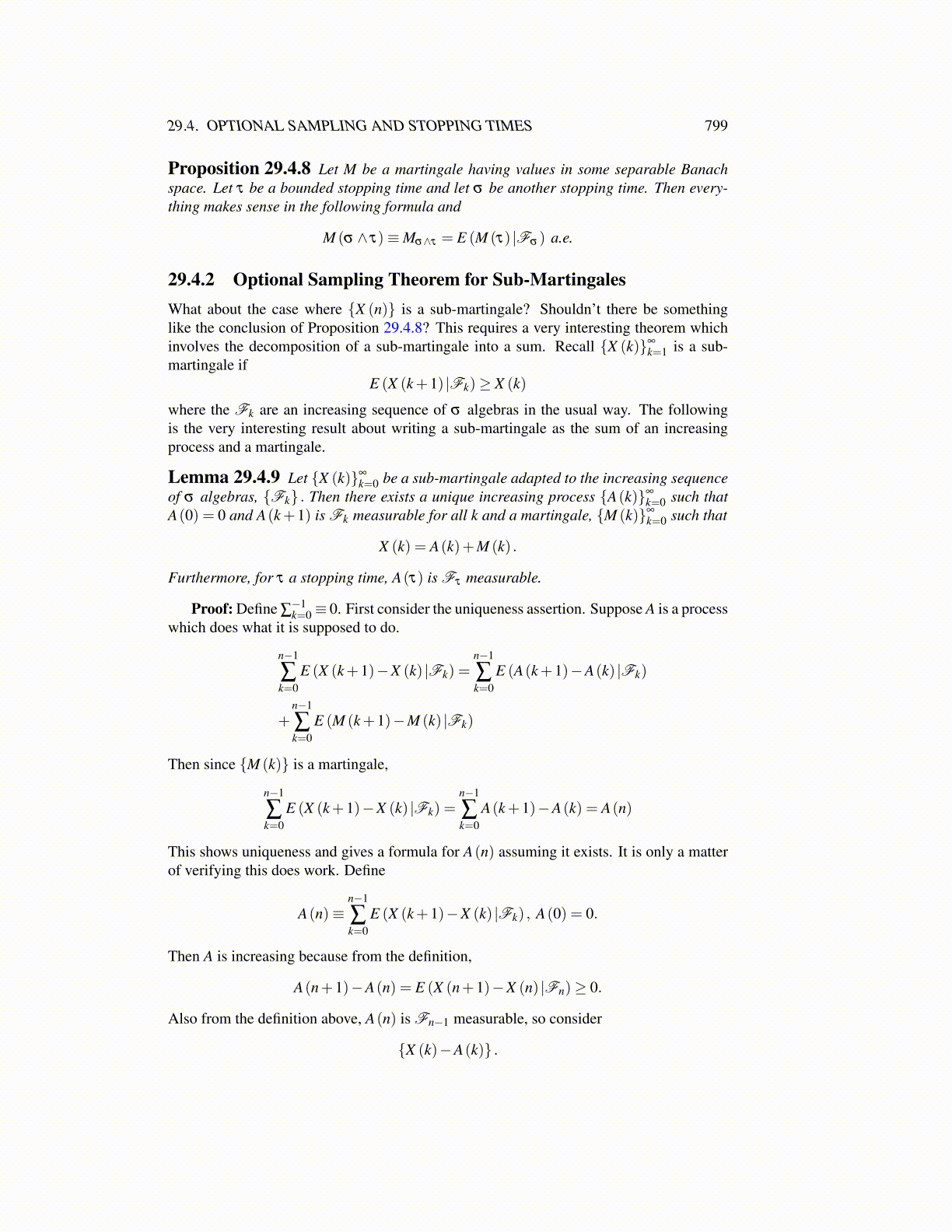 29.4.2 Optional Sampling Theorem for Sub-MartingalesWhat about the case where {X (n)} is a sub-martingale? Shouldn’t there be somethinglike the conclusion of Proposition 29.4.8? This requires a very interesting theorem whichinvolves the decomposition of a sub-martingale into a sum. Recall {X (k)}∞