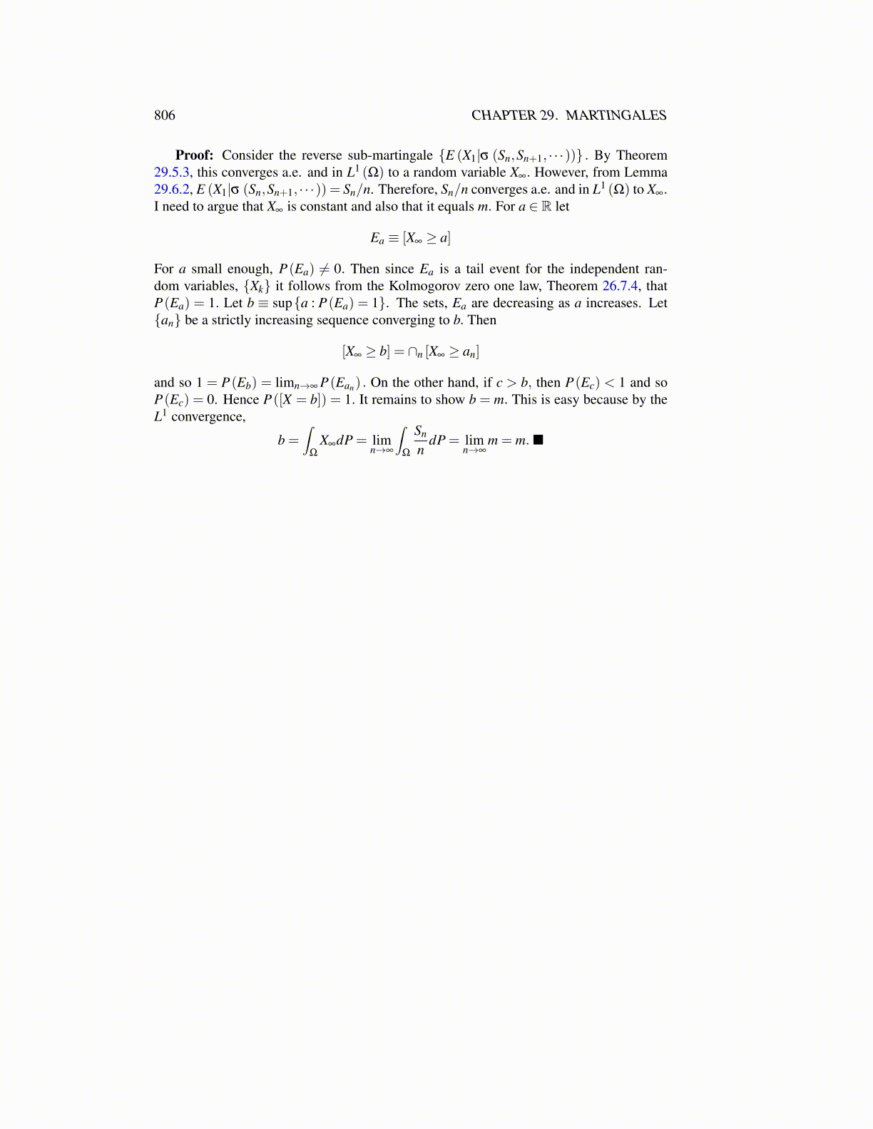 Proof: Consider the reverse sub-martingale {E (X1|σ (Sn,Sn+1, · · ·))} . By Theorem29.5.3, this converges a.e. and in L1 (Ω) to a random variable X∞. However, from Lemma29.6.2, E (X1|σ (Sn,Sn+1, · · ·)) = Sn/n. Therefore, Sn/n converges a.e. and in L1 (Ω) to X∞.I need to argue that X∞ is constant and also that it equals m. For a ∈ R let