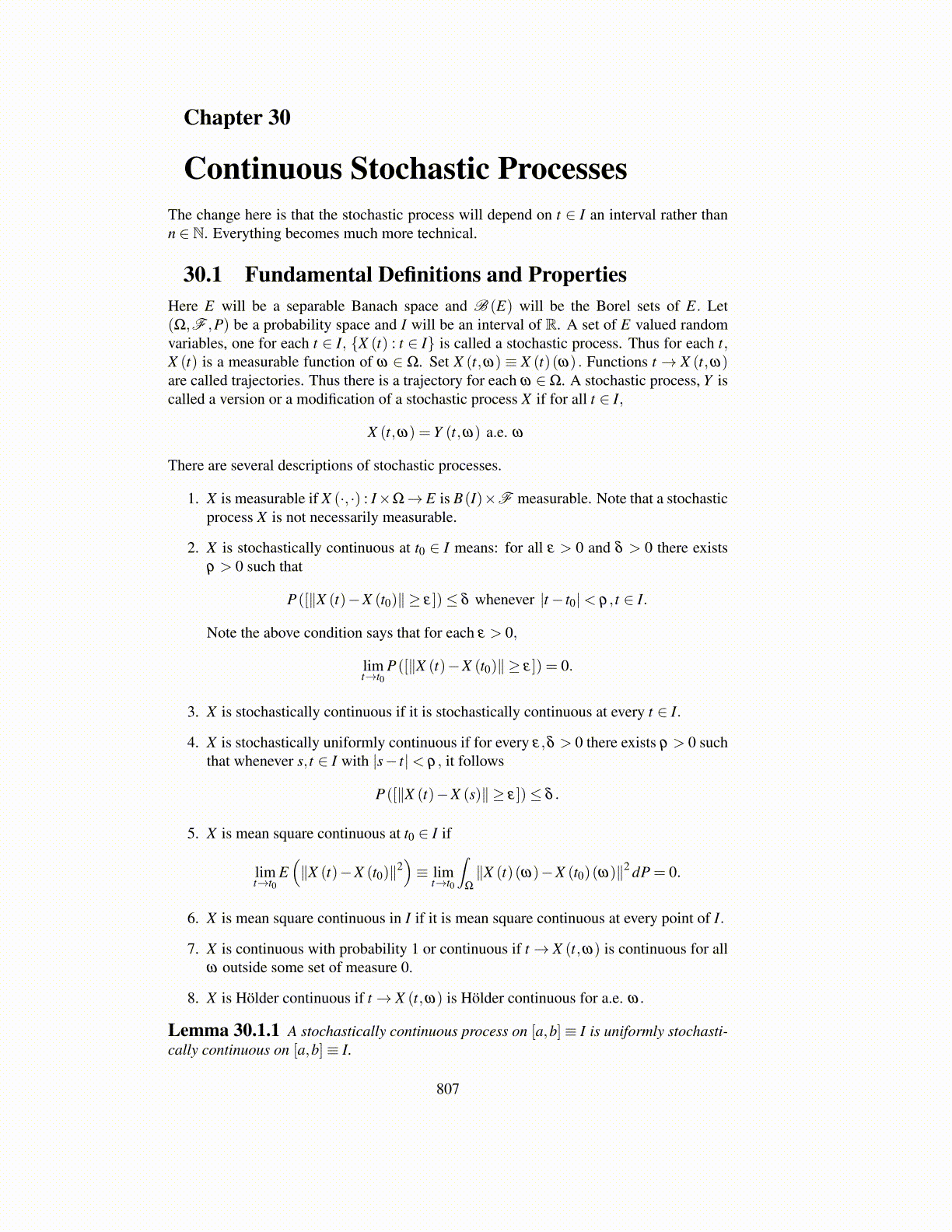 30.1 Fundamental Definitions and PropertiesHere E will be a separable Banach space and B (E) will be the Borel sets of E. Let(Ω,F ,P) be a probability space and I will be an interval of R. A set of E valued randomvariables, one for each t ∈ I, {X (t) : t ∈ I} is called a stochastic process. Thus for each t,X (t) is a measurable function of ω ∈ Ω. Set X (t,ω) ≡ X (t)(ω) . Functions t → X (t,ω)are called trajectories. Thus there is a trajectory for each ω ∈Ω. A stochastic process, Y iscalled a version or a modification of a stochastic process X if for all t ∈ I,