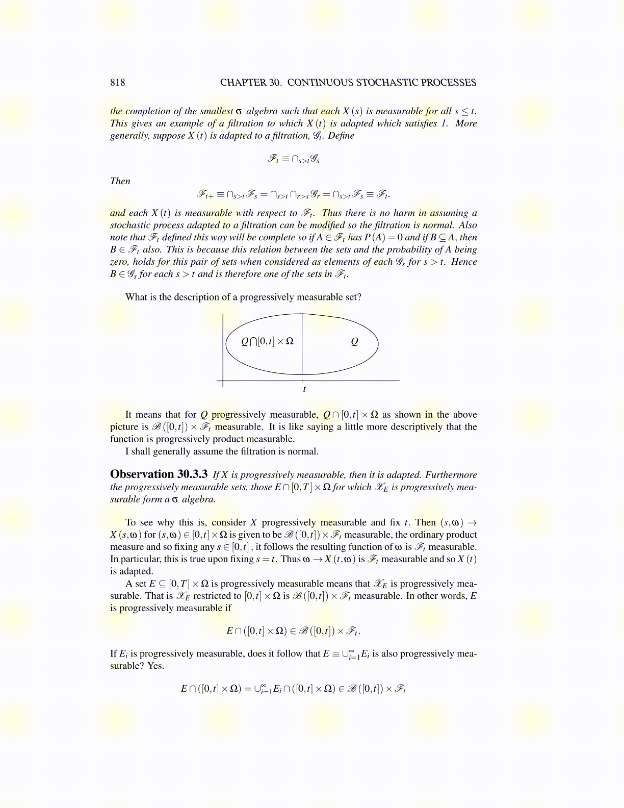 Observation 30.3.3 If X is progressively measurable, then it is adapted. Furthermorethe progressively measurable sets, those E∩ [0,T ]×Ω for which XE is progressively mea-surable form a σ algebra.