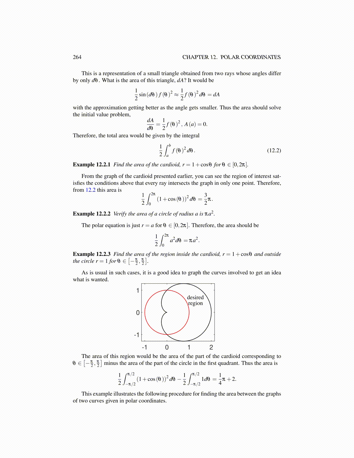 Example 12.2.3 Find the area of the region inside the cardioid, r = 1+ cosθ and outsidethe circle r = 1 for θ ∈