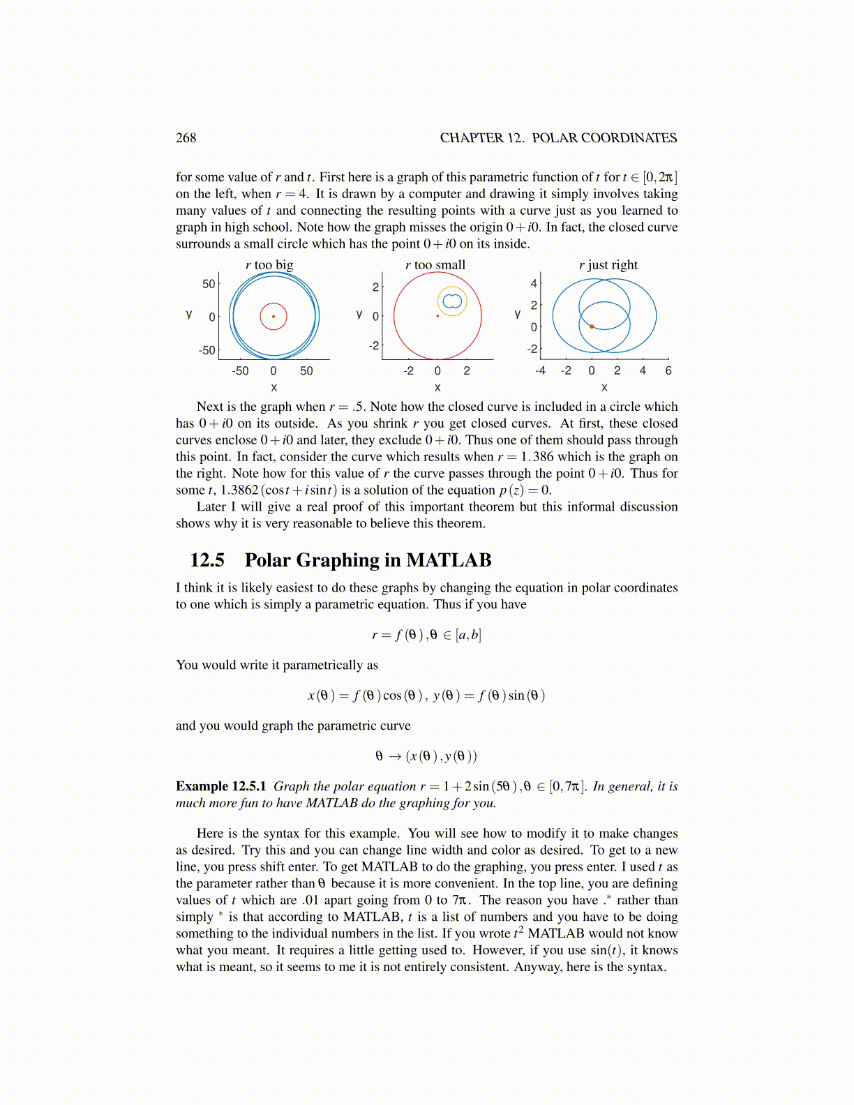 Next is the graph when r = .5. Note how the closed curve is included in a circle whichhas 0+ i0 on its outside. As you shrink r you get closed curves. At first, these closedcurves enclose 0+ i0 and later, they exclude 0+ i0. Thus one of them should pass throughthis point. In fact, consider the curve which results when r = 1.386 which is the graph onthe right. Note how for this value of r the curve passes through the point 0+ i0. Thus forsome t, 1.3862(cos t + isin t) is a solution of the equation p(z) = 0.