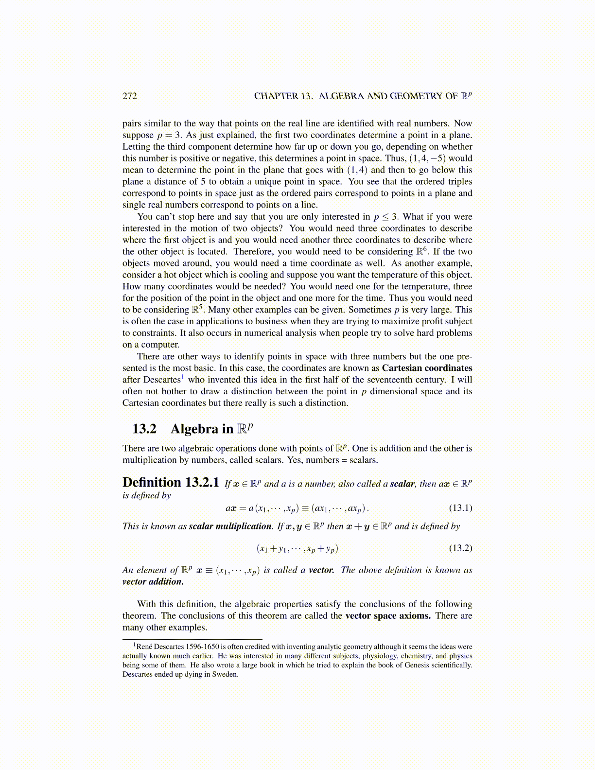 You can’t stop here and say that you are only interested in p ≤ 3. What if you wereinterested in the motion of two objects? You would need three coordinates to describewhere the first object is and you would need another three coordinates to describe wherethe other object is located. Therefore, you would need to be considering R6. If the twoobjects moved around, you would need a time coordinate as well. As another example,consider a hot object which is cooling and suppose you want the temperature of this object.How many coordinates would be needed? You would need one for the temperature, threefor the position of the point in the object and one more for the time. Thus you would needto be considering R5. Many other examples can be given. Sometimes p is very large. Thisis often the case in applications to business when they are trying to maximize profit subjectto constraints. It also occurs in numerical analysis when people try to solve hard problemson a computer.