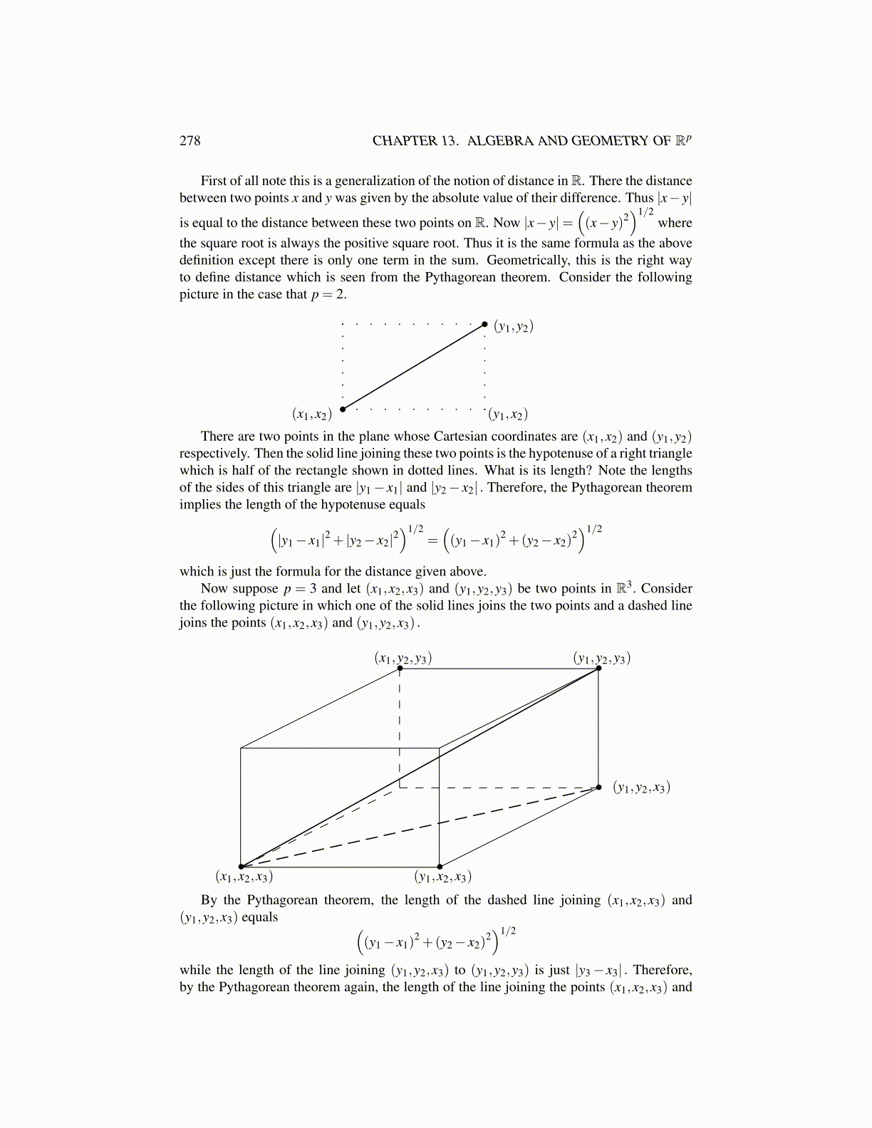 which is just the formula for the distance given above.Now suppose p = 3 and let (x1,x2,x3) and (y1,y2,y3) be two points in R3. Consider