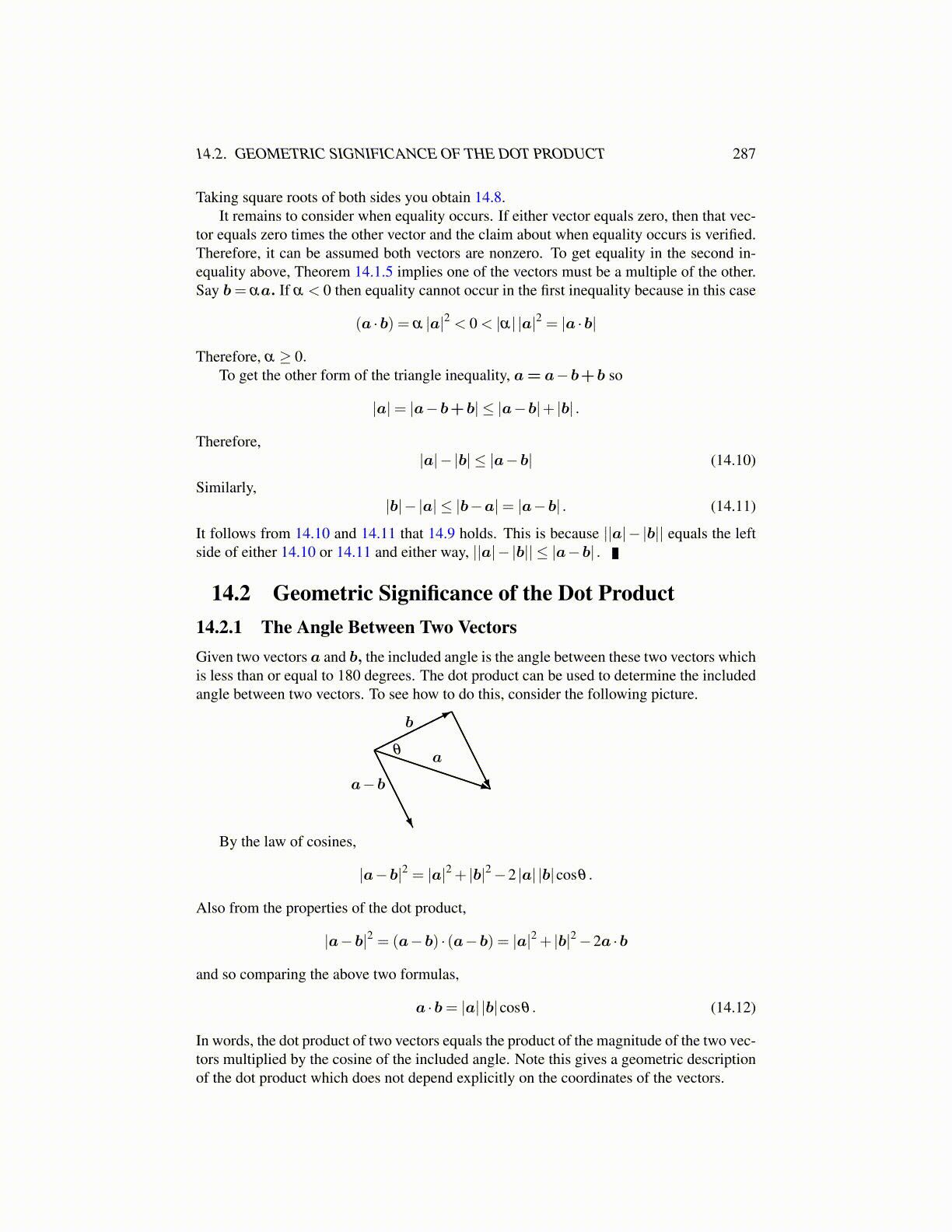 tor equals zero times the other vector and the claim about when equality occurs is verified.Therefore, it can be assumed both vectors are nonzero. To get equality in the second in-equality above, Theorem 14.1.5 implies one of the vectors must be a multiple of the other.Say b= αa. If α < 0 then equality cannot occur in the first inequality because in this case