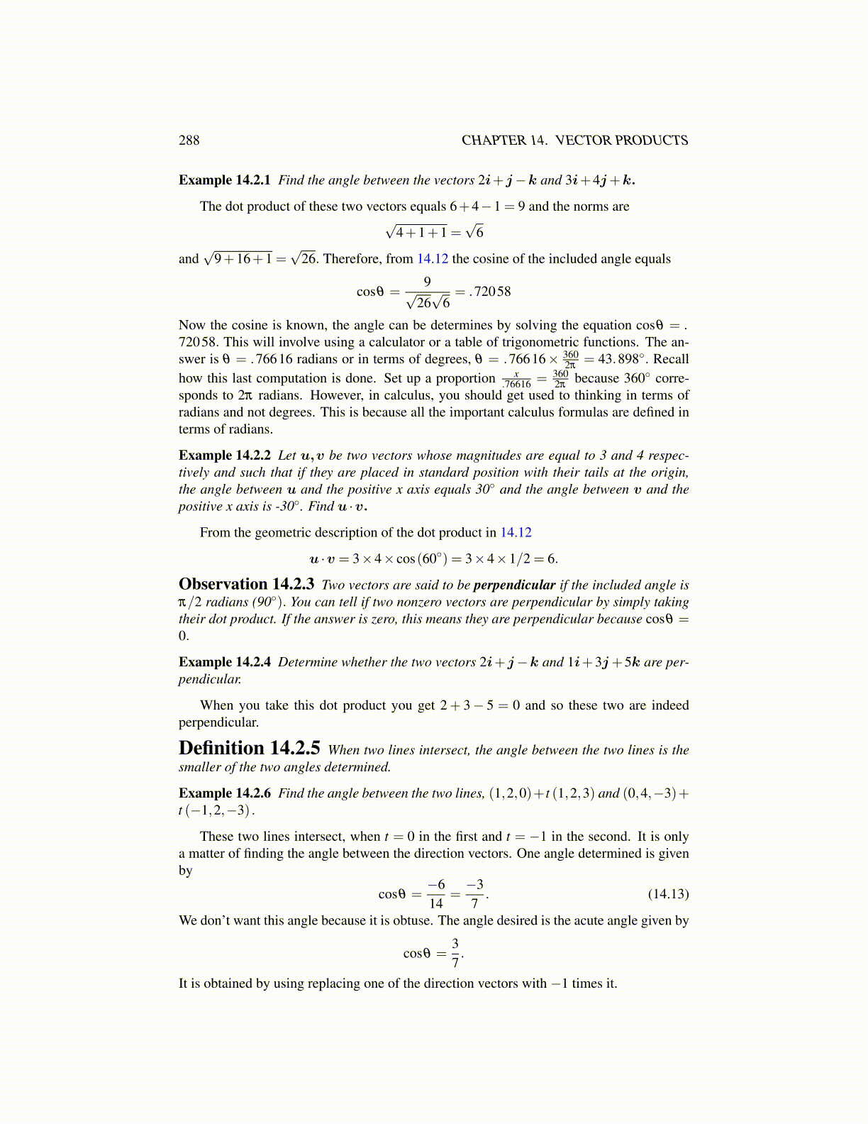 Now the cosine is known, the angle can be determines by solving the equation cosθ = .72058. This will involve using a calculator or a table of trigonometric functions. The an-swer is θ = .76616 radians or in terms of degrees, θ = .76616× 360