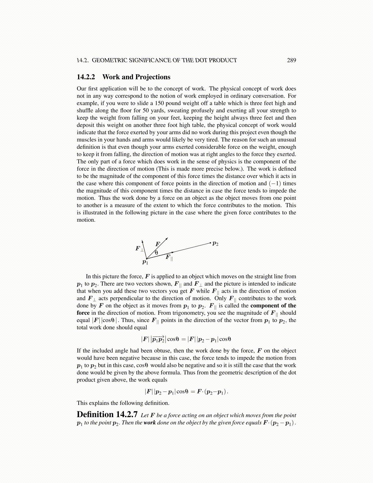 Definition 14.2.7 Let F be a force acting on an object which moves from the pointp1 to the point p2. Then the work done on the object by the given force equals F ·(p2 −p1) .