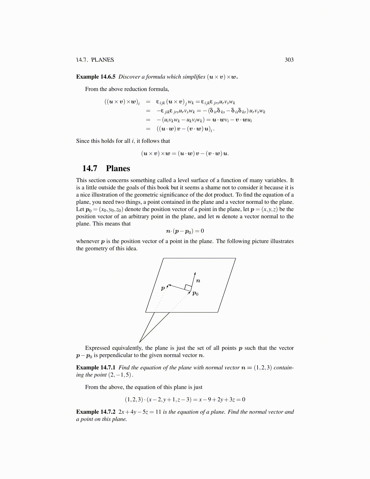 14.7 PlanesThis section concerns something called a level surface of a function of many variables. Itis a little outside the goals of this book but it seems a shame not to consider it because it isa nice illustration of the geometric significance of the dot product. To find the equation of aplane, you need two things, a point contained in the plane and a vector normal to the plane.Let p0 = (x0,y0,z0) denote the position vector of a point in the plane, let p= (x,y,z) be theposition vector of an arbitrary point in the plane, and let n denote a vector normal to theplane. This means that