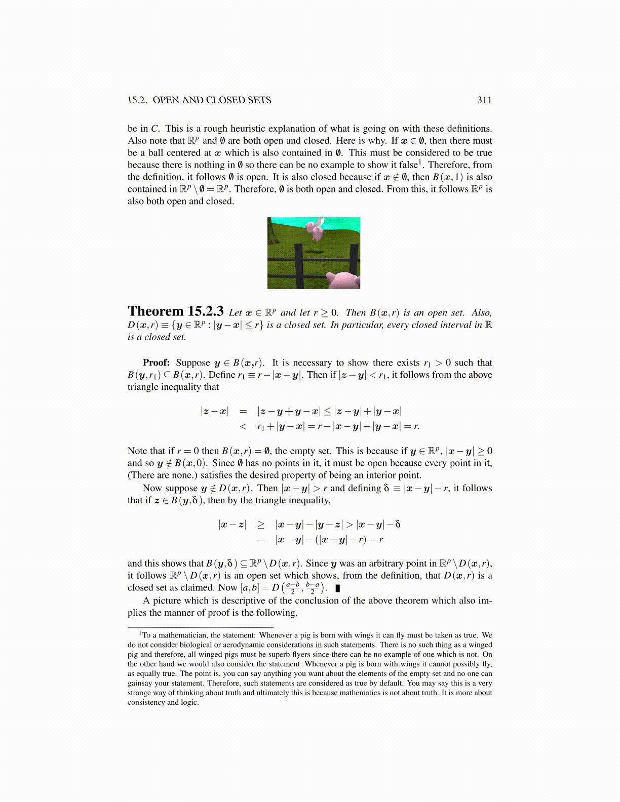 Theorem 15.2.3 Let x ∈ Rp and let r ≥ 0. Then B(x,r) is an open set. Also,D(x,r) ≡ {y ∈ Rp : |y−x| ≤ r} is a closed set. In particular, every closed interval in Ris a closed set.