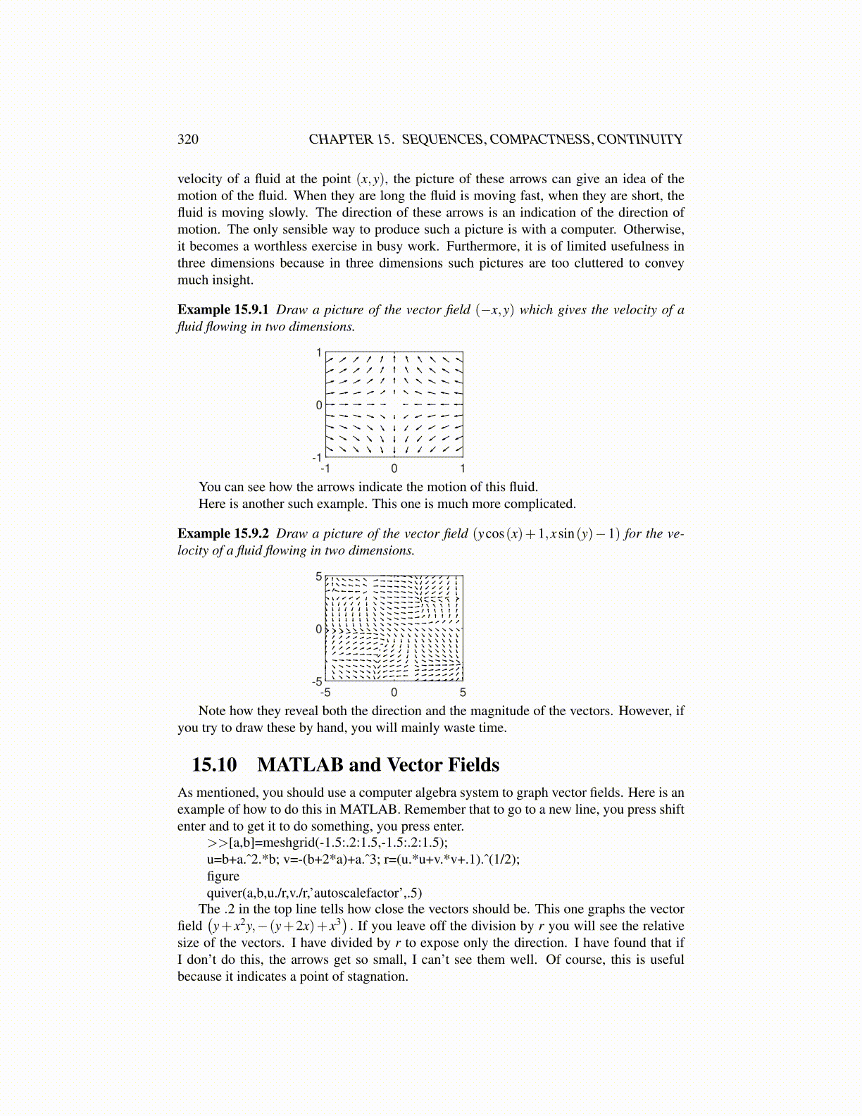 15.10 MATLAB and Vector FieldsAs mentioned, you should use a computer algebra system to graph vector fields. Here is anexample of how to do this in MATLAB. Remember that to go to a new line, you press shiftenter and to get it to do something, you press enter.