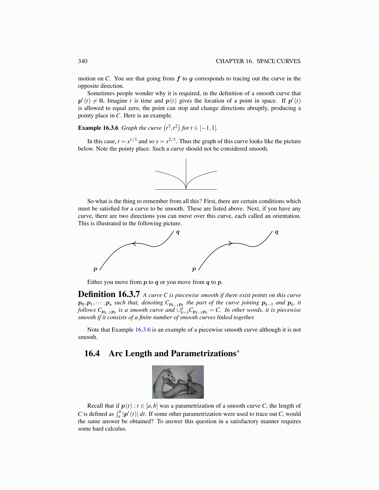 Definition 16.3.7 A curve C is piecewise smooth if there exist points on this curvep0,p1, · · · ,pn such that, denoting Cpk−1pk the part of the curve joining pk−1 and pk, itfollows Cpk−1pk is a smooth curve and ∪n