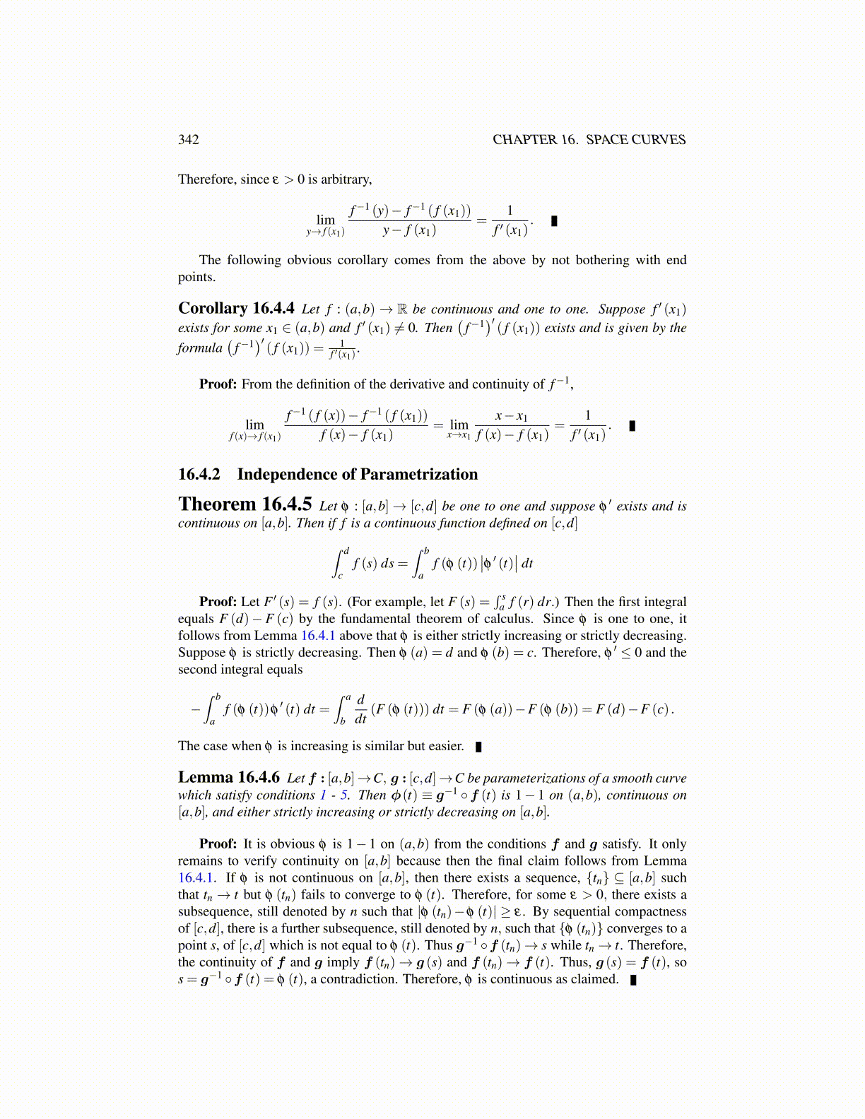 Lemma 16.4.6 Let f : [a,b]→C, g : [c,d]→C be parameterizations of a smooth curvewhich satisfy conditions 1 - 5. Then ϕ(t) ≡ g−1 ◦f (t) is 1− 1 on (a,b), continuous on[a,b], and either strictly increasing or strictly decreasing on [a,b].