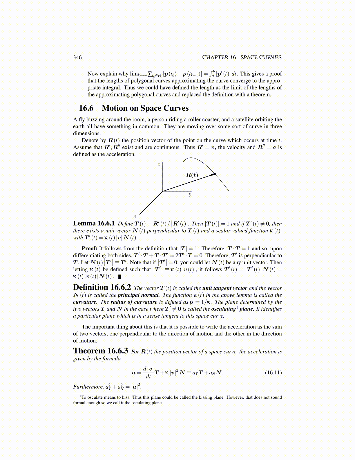 Definition 16.6.2 The vector T (t) is called the unit tangent vector and the vectorN (t) is called the principal normal. The function κ (t) in the above lemma is called thecurvature. The radius of curvature is defined as ρ = 1/κ . The plane determined by thetwo vectors T and N in the case where T ′ ̸= 0 is called the osculating1 plane. It identifiesa particular plane which is in a sense tangent to this space curve.